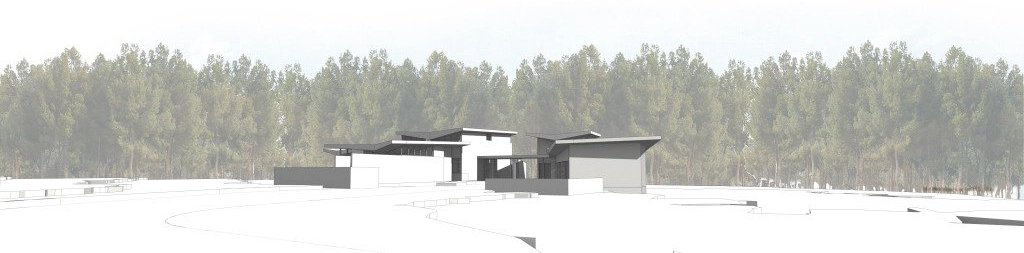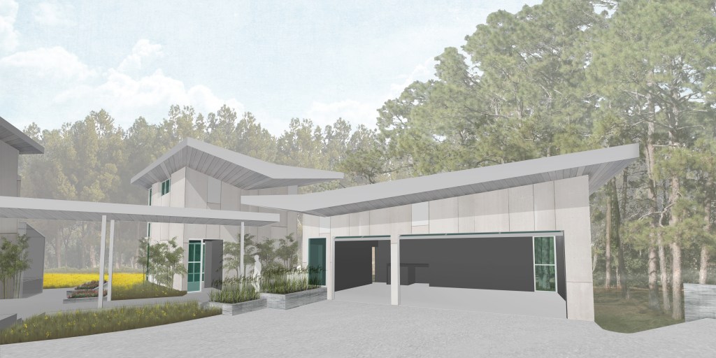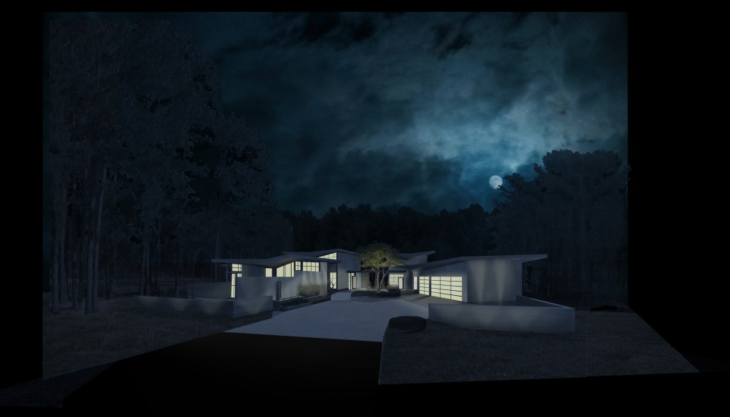 The arrival court, framed by the main house, guest studio, and car park offers acts as the garden of pools and vegetation where we leave our vehicles and move deeper into the collective of natural and architectural spaces. The house is adapted from a similar tripartite scheme designed for a waterfront site in Nova Scotia. Here, a much more substantial car park is added to complete the entry courts as a formal arrival space. Construction is scheduled for late 2024.