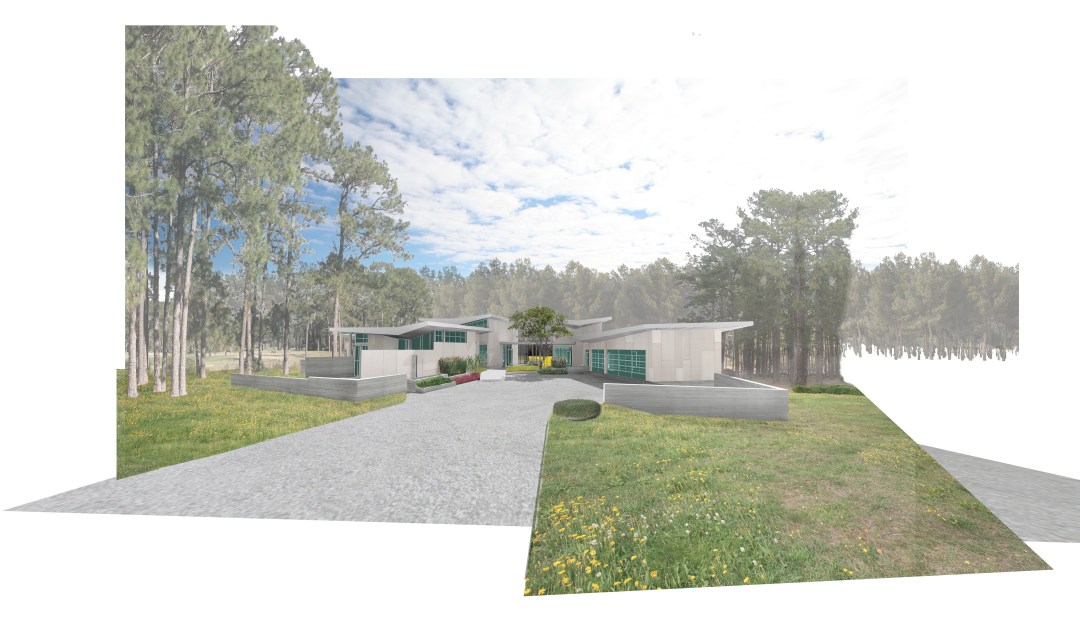 The home has a master suite with a large bathroom, walk-in closet and dressing area, office, and a private exterior jacuzzi deck (screened). The family module houses the main living spaces with a large kitchen, interior dining, exterior dining, living, laundry room, pantry room, and two guest suites (bedroom bathroom combinations). The studio has a living room, kitchenette, bathroom, and sleeping loft and offers the most privacy from the other spaces. The three-car garage houses storage, workshop space, and some of the home utilities.
