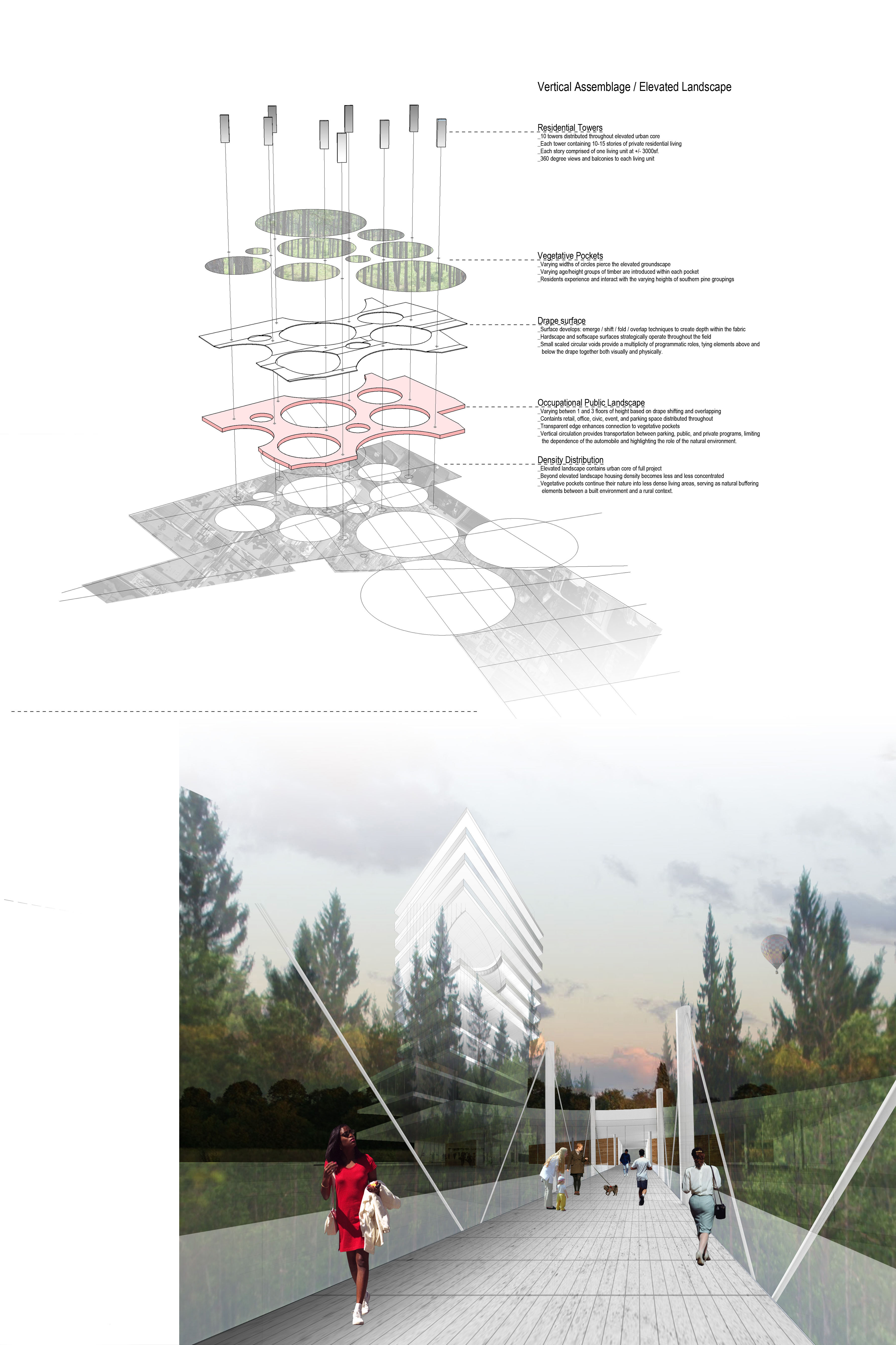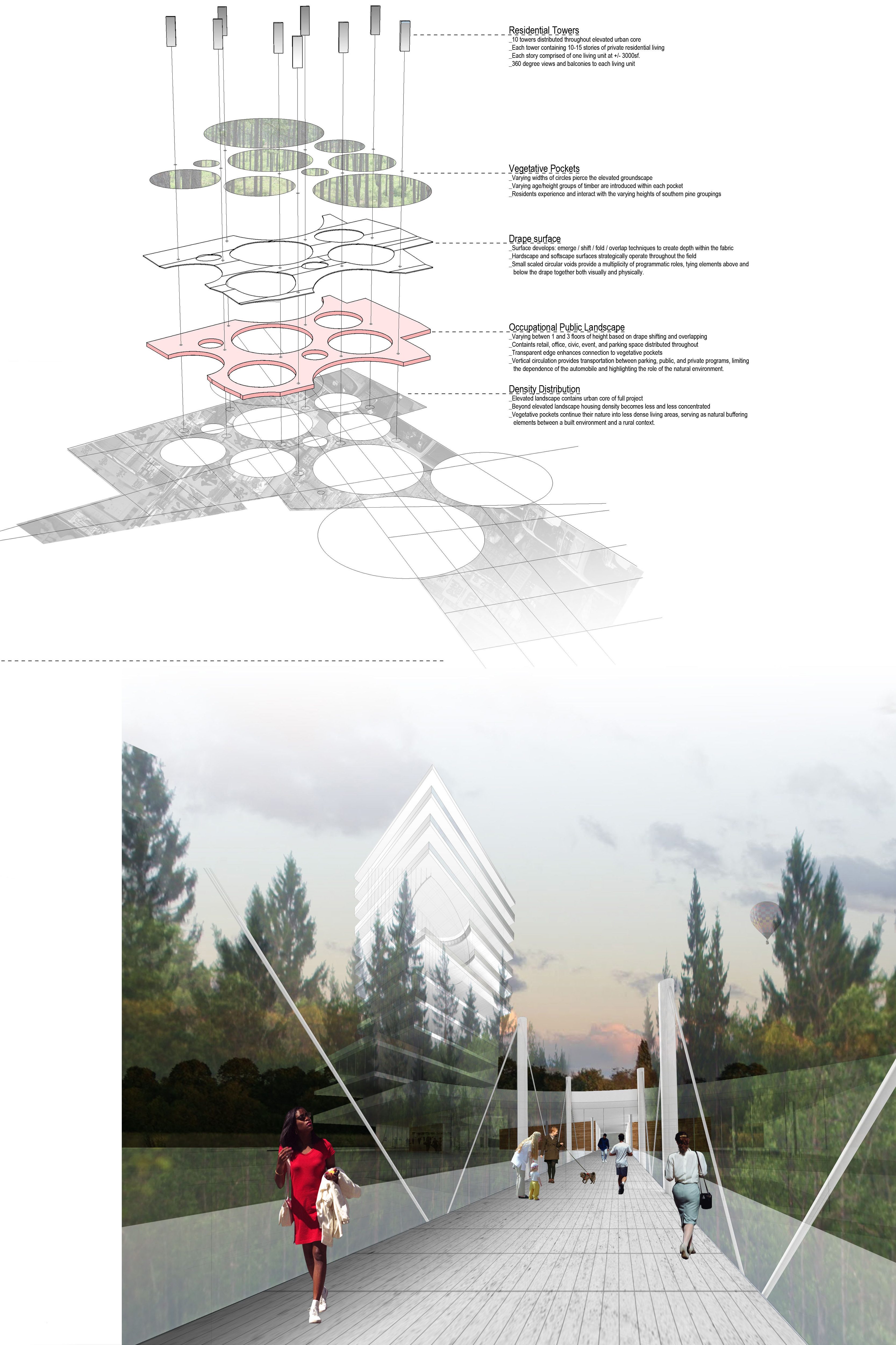 Cluster Drape is a direct expression of the operations engaged to organize a highly integrated living, manufacturing, and agriculture development. Cluster gathers the residential and commercial into highly compact forms using vertical housing to provide visual amenity, proximity to diverse commerce, and to provide the density necessary to support viable transit to nearby destinations.