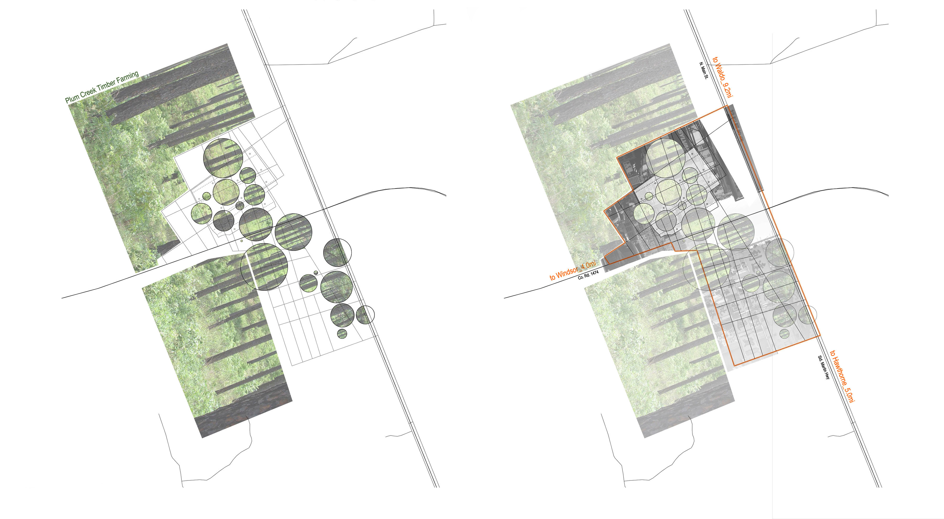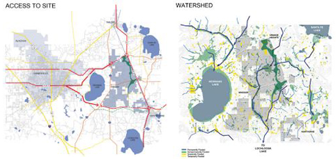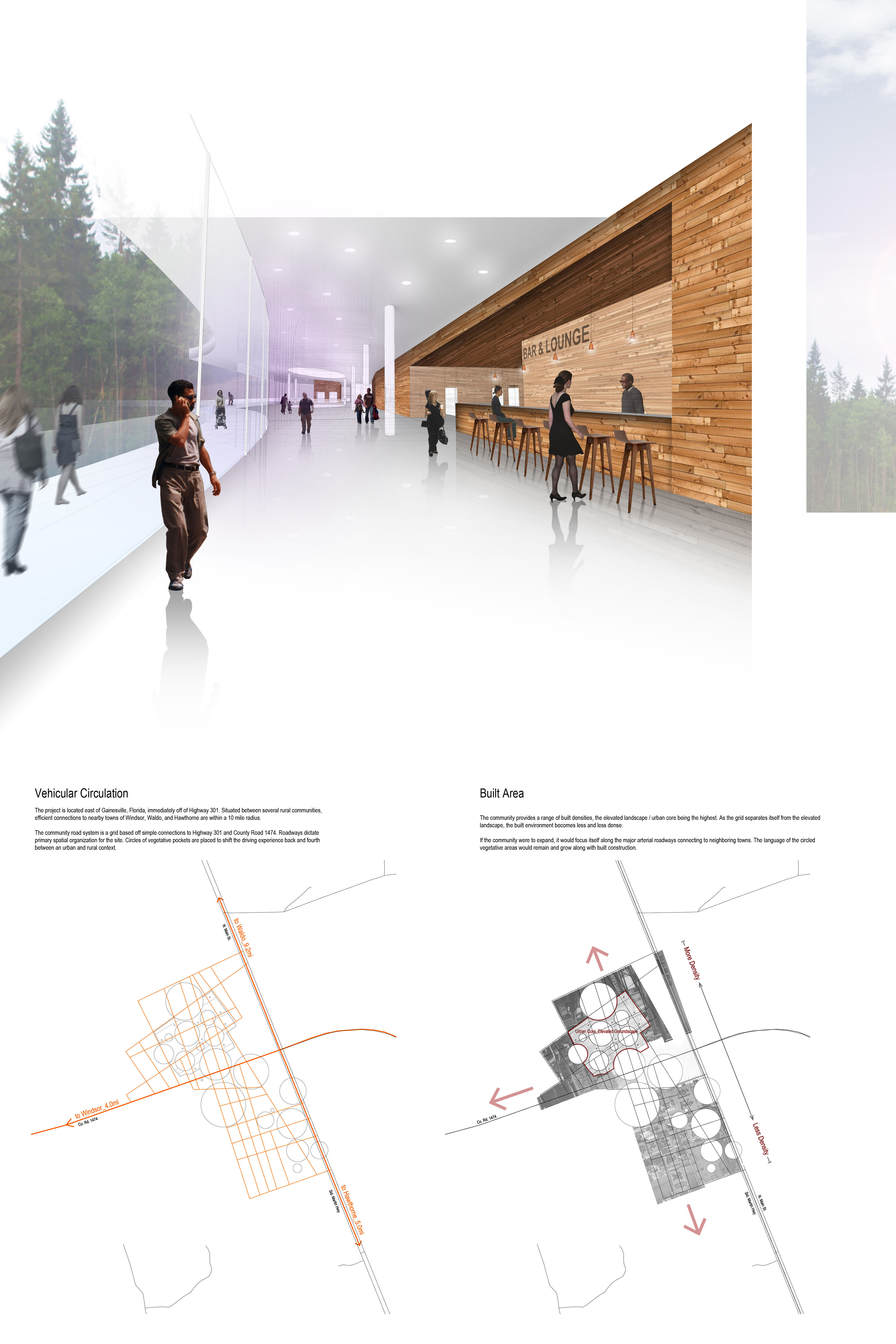 The project is located east of Gainesville, Florida, immediately off of Highway 301. Situated between several rural communities, efficient connections to nearby towns of Windsor, Waldo, and Hawthorne are within a 10-mile radius. The community road system is grid-based on simple connections to Highway 301 and County Road 1474. Roadways dictate primary spatial organization for the site. Circles of vegetative pockets are placed to shift the driving experience back and forth between urban and rural contexts.