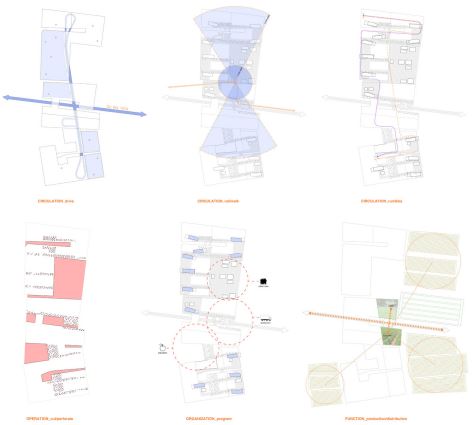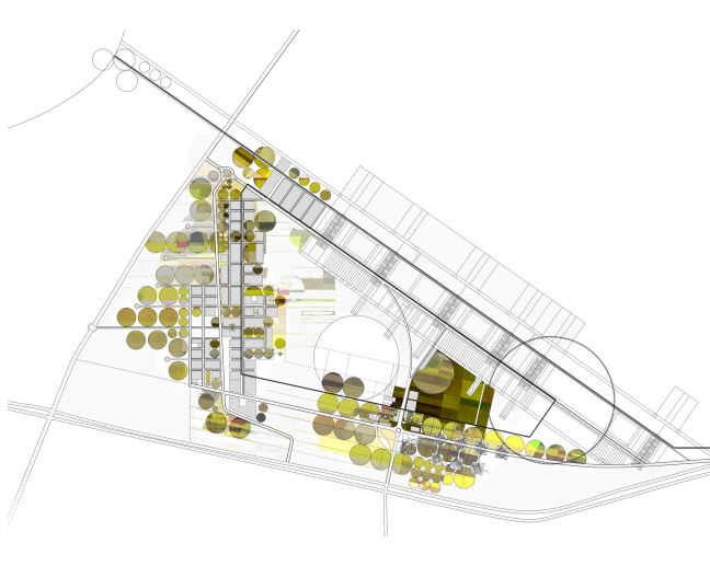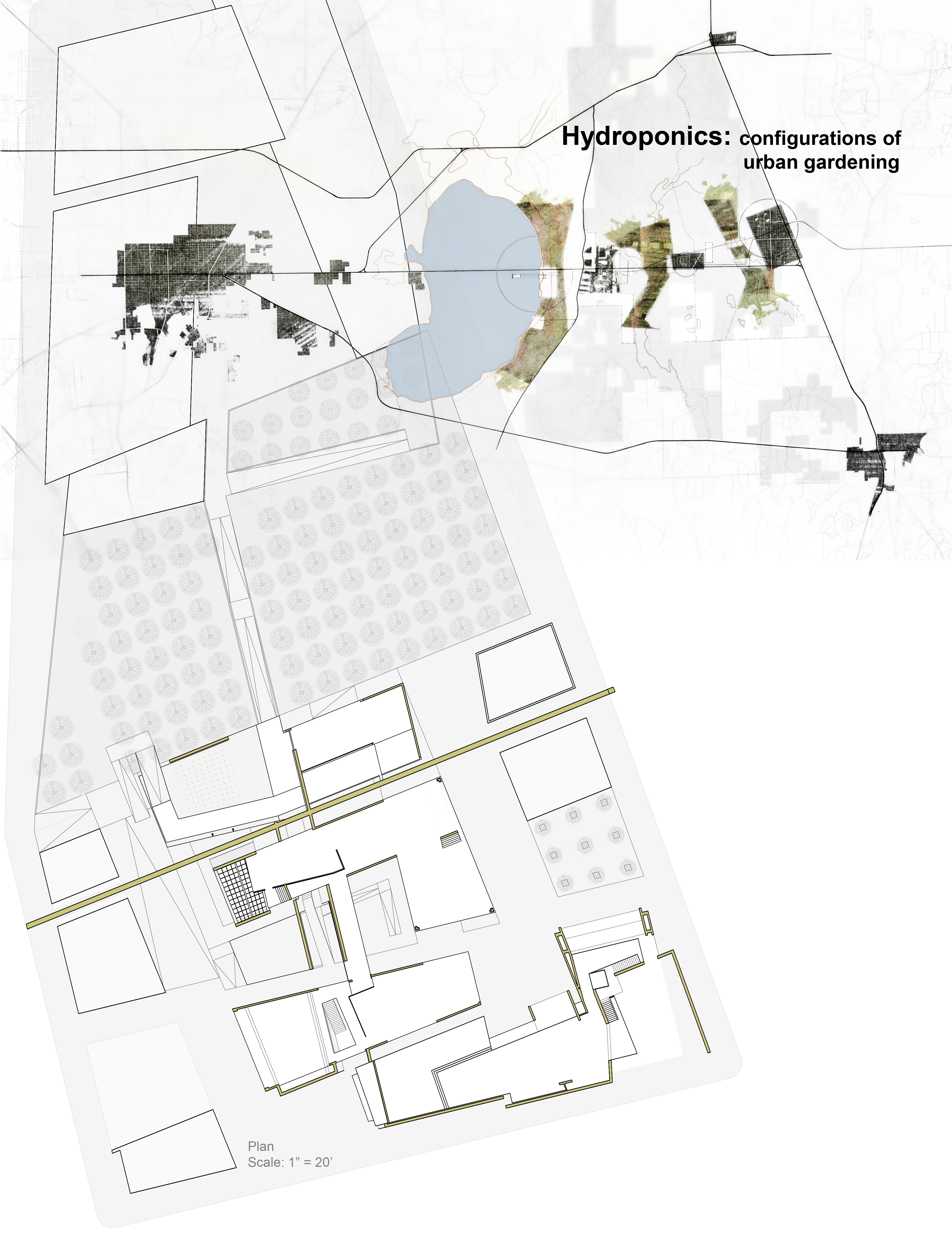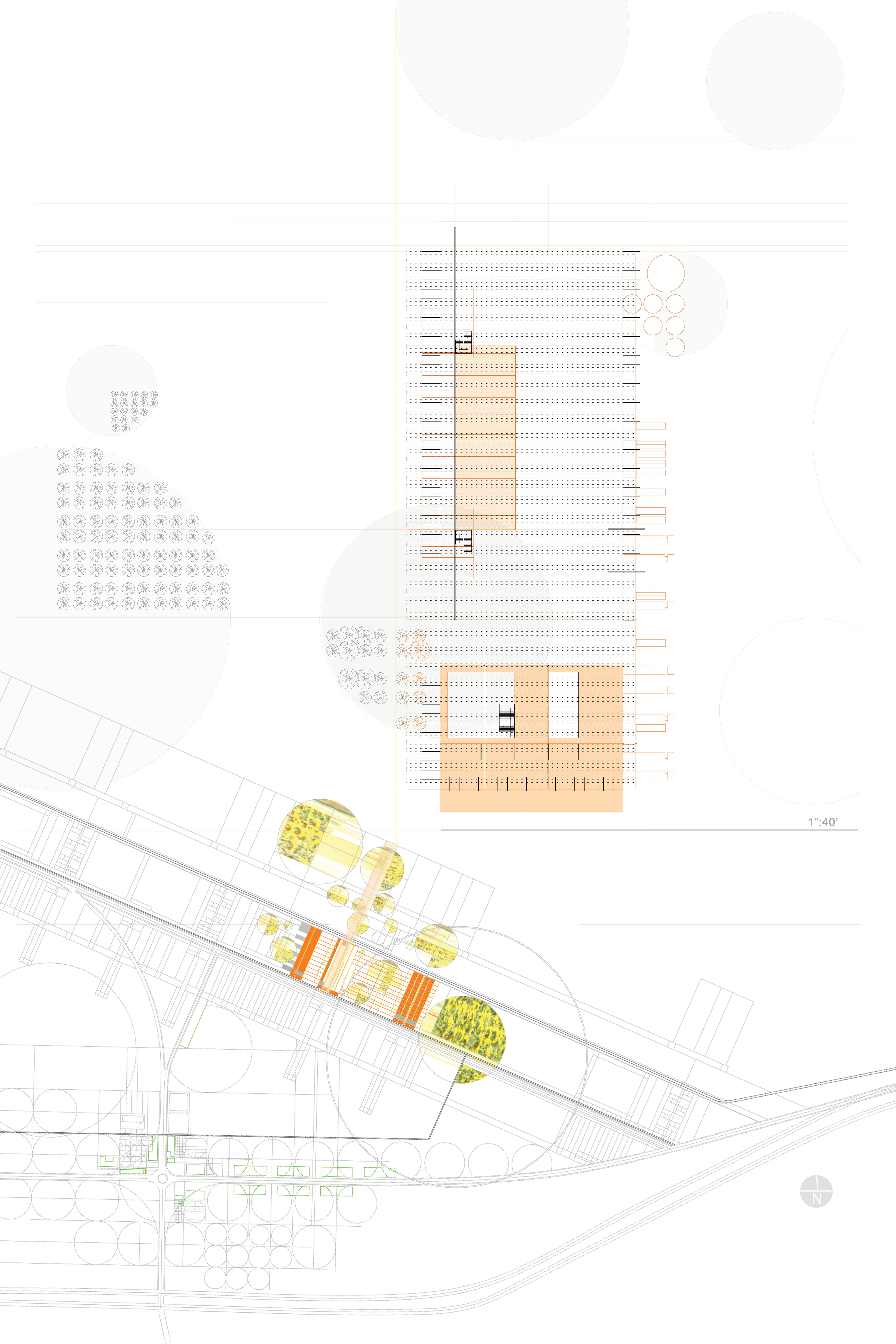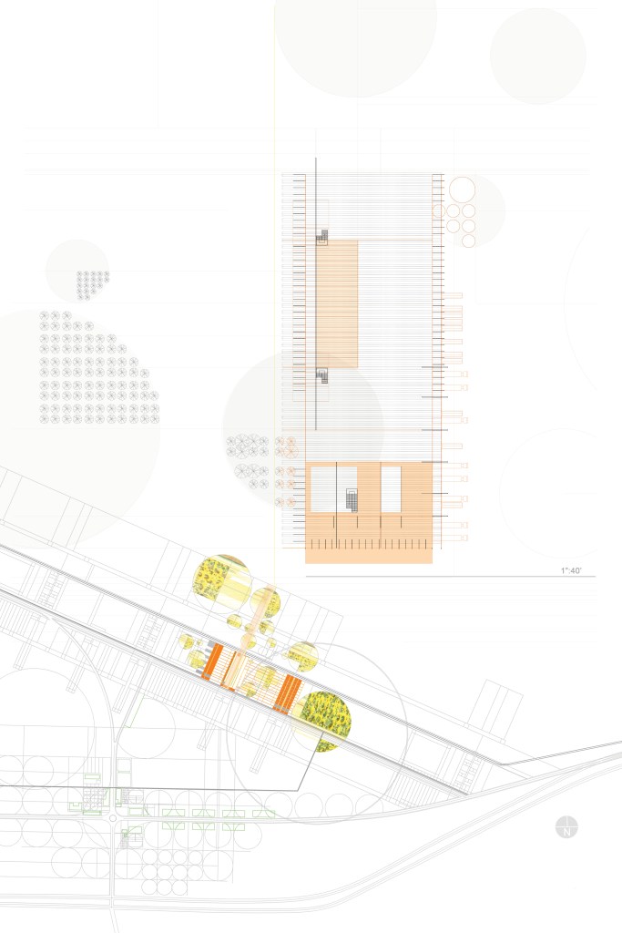 The concept focused on creating strategic experiences for the circulation of both pedestrian and vehicular traffic. The scheme stretched the length of the site, allowing for a cohesive implementation and integration of agriculture and architecture embedded with low and high-density regions. Within each cluster, a patchwork of programmed vegetation allows for diverse and productive agriculture to occur. A wide range of vegetative crops become an active ingredient in the recipe for urbanism.