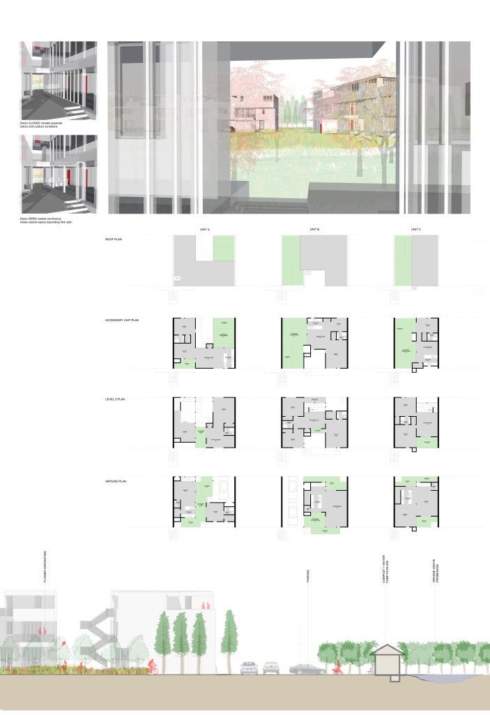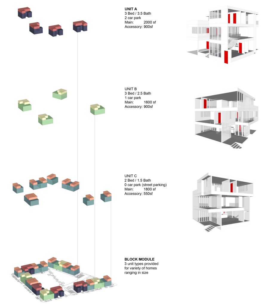 Three unit types are provided, each with an accessory unit on the third floor. Program elements have been stacked for efficiency within each unit in order to allow residents the luxuries of single-family housing without sacrificing for compact living.