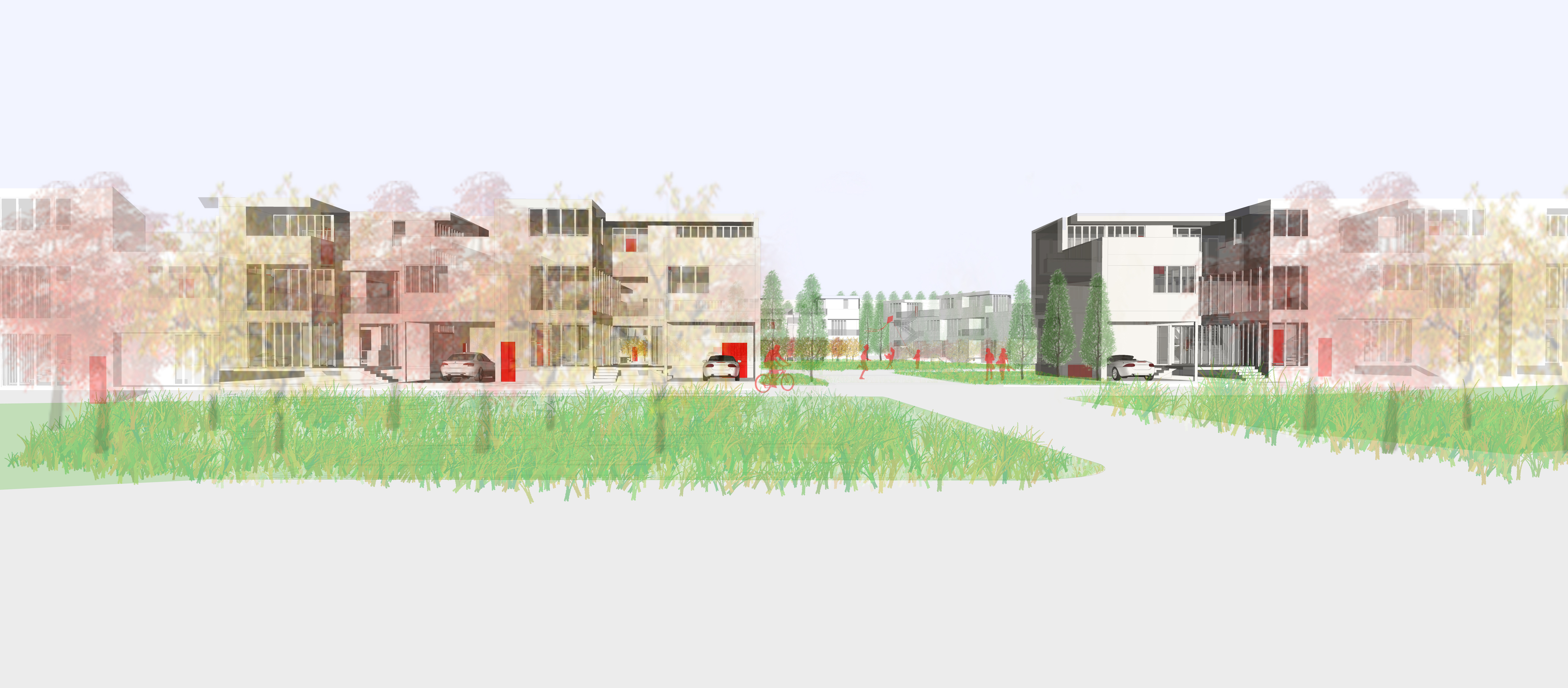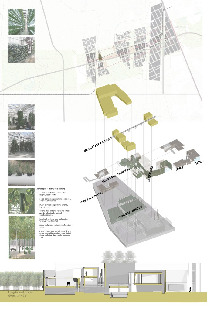 These proposals seek to accommodate housing ranging from suburban to high-density nodes to offer the widest range of inhabitation – large families to singles – while offering activities, jobs, and recreation for the young through the elderly. In particular, the idea of ‘cultivation’ as a model for community living and as a literal translation of agriculture, provides the underpinnings for a community that can continue to reinvent itself, invest in itself, and have the opportunity to export food, plants, technology, and expertise as a self-reinforcing economic niche.