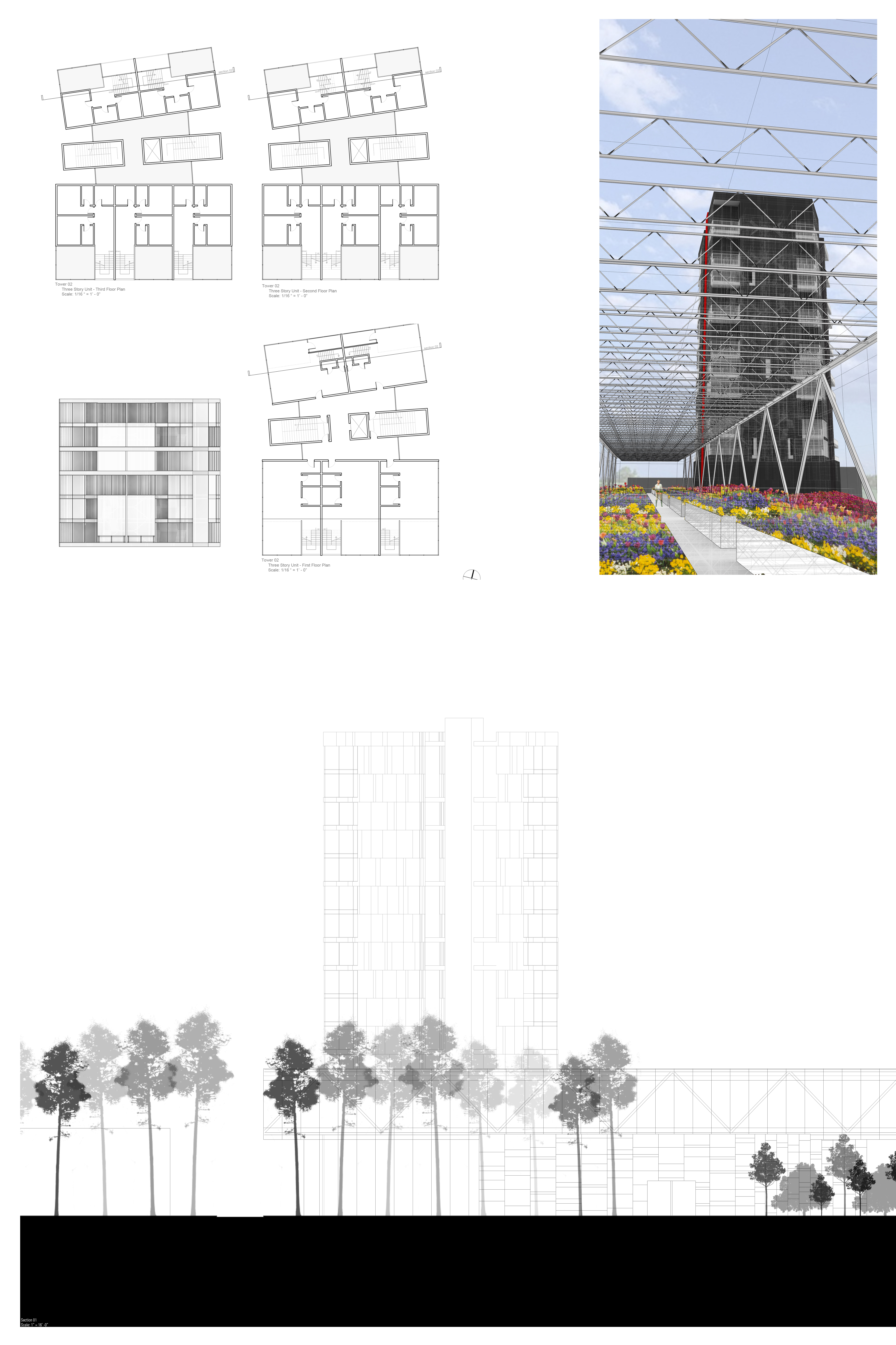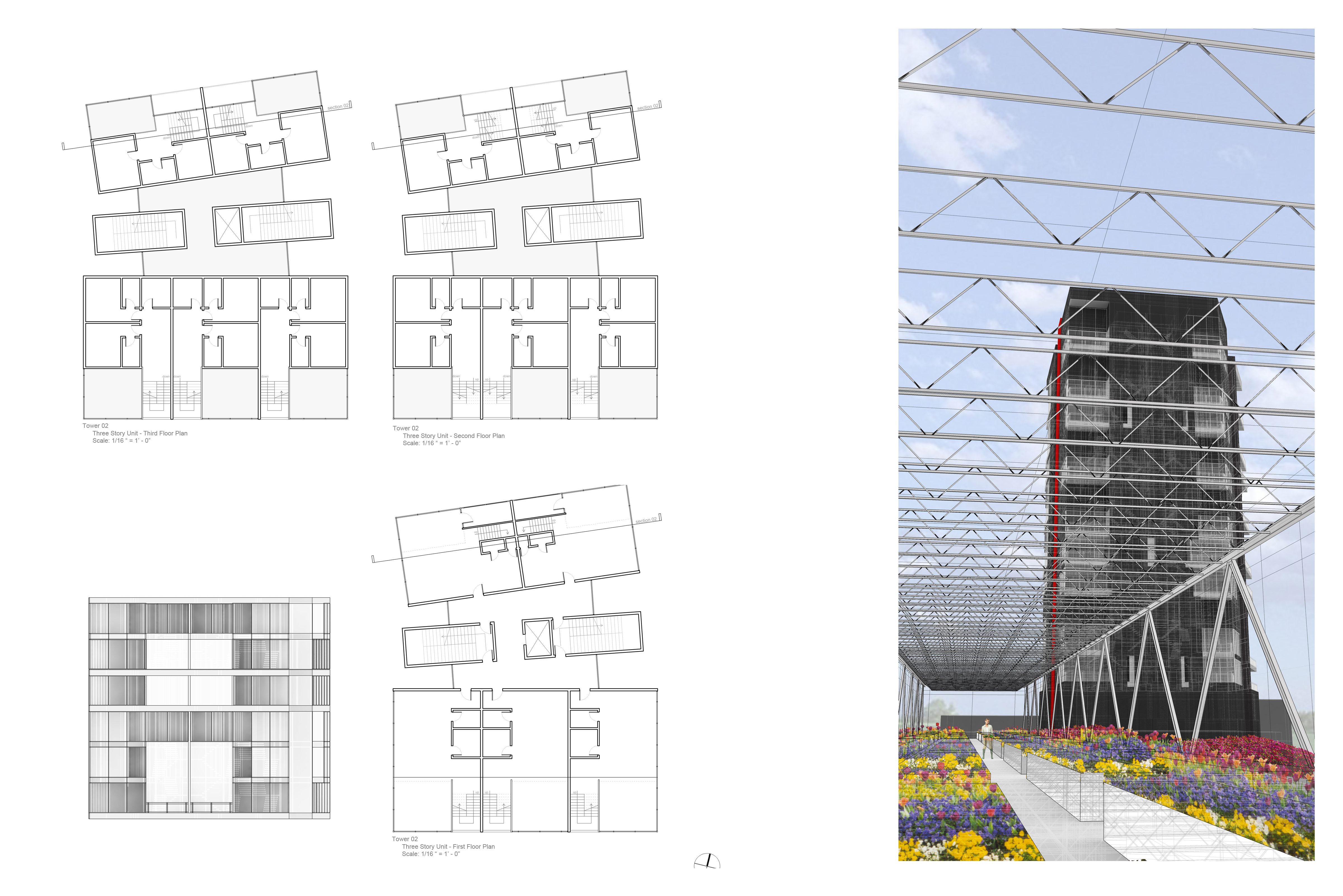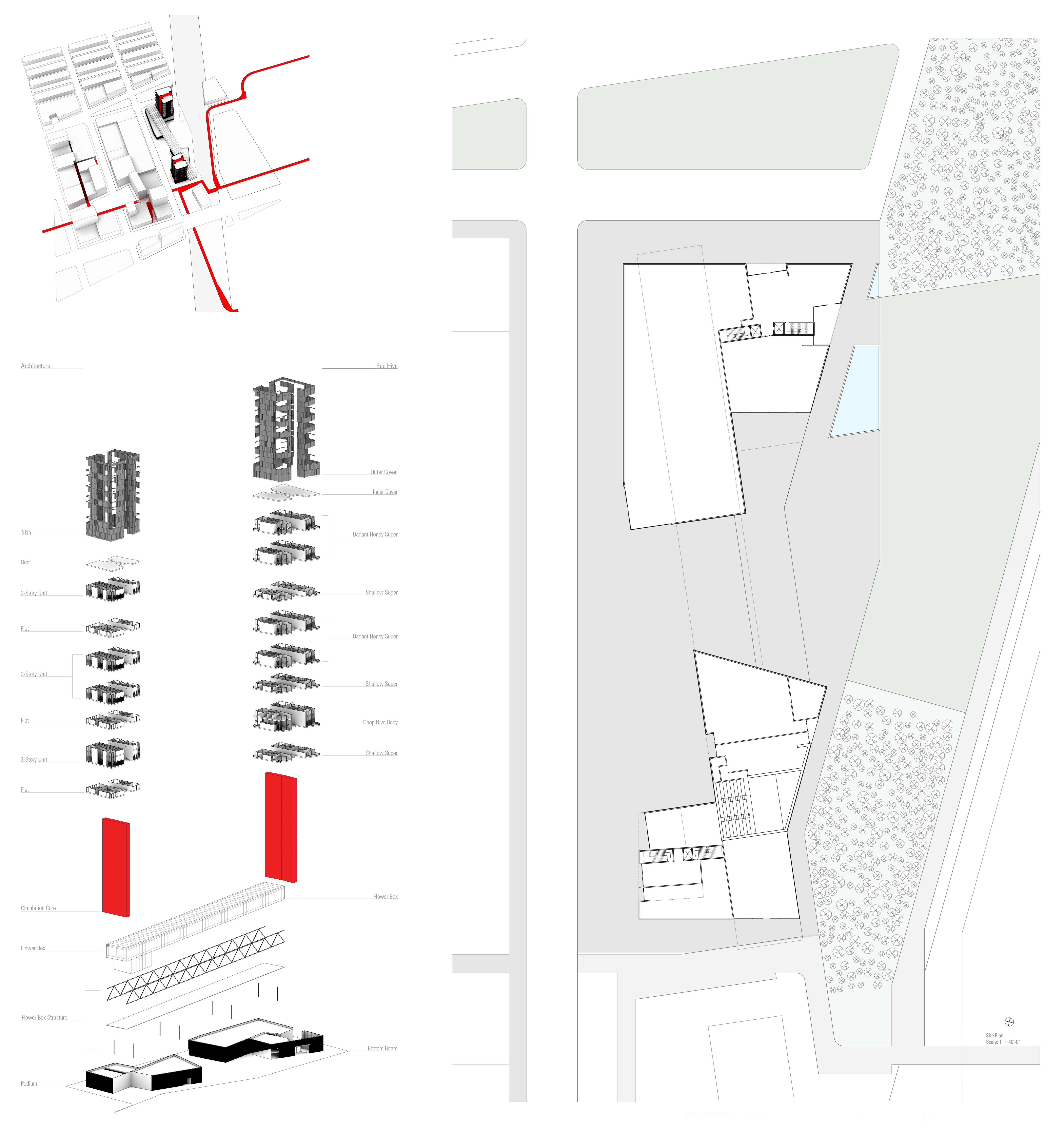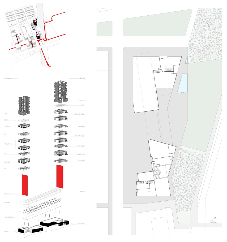 Anchored on the north and south by two residential towers, the mixed-use project has retail shops and a community theater on the first two levels. The “Flower Box” mediates the gap between the two towers, allowing for unobstructed views from the residential units to the “corridors” and serves as the catalyst for Agri-Urbanism, allowing for the production of honey in the Apiary Towers.