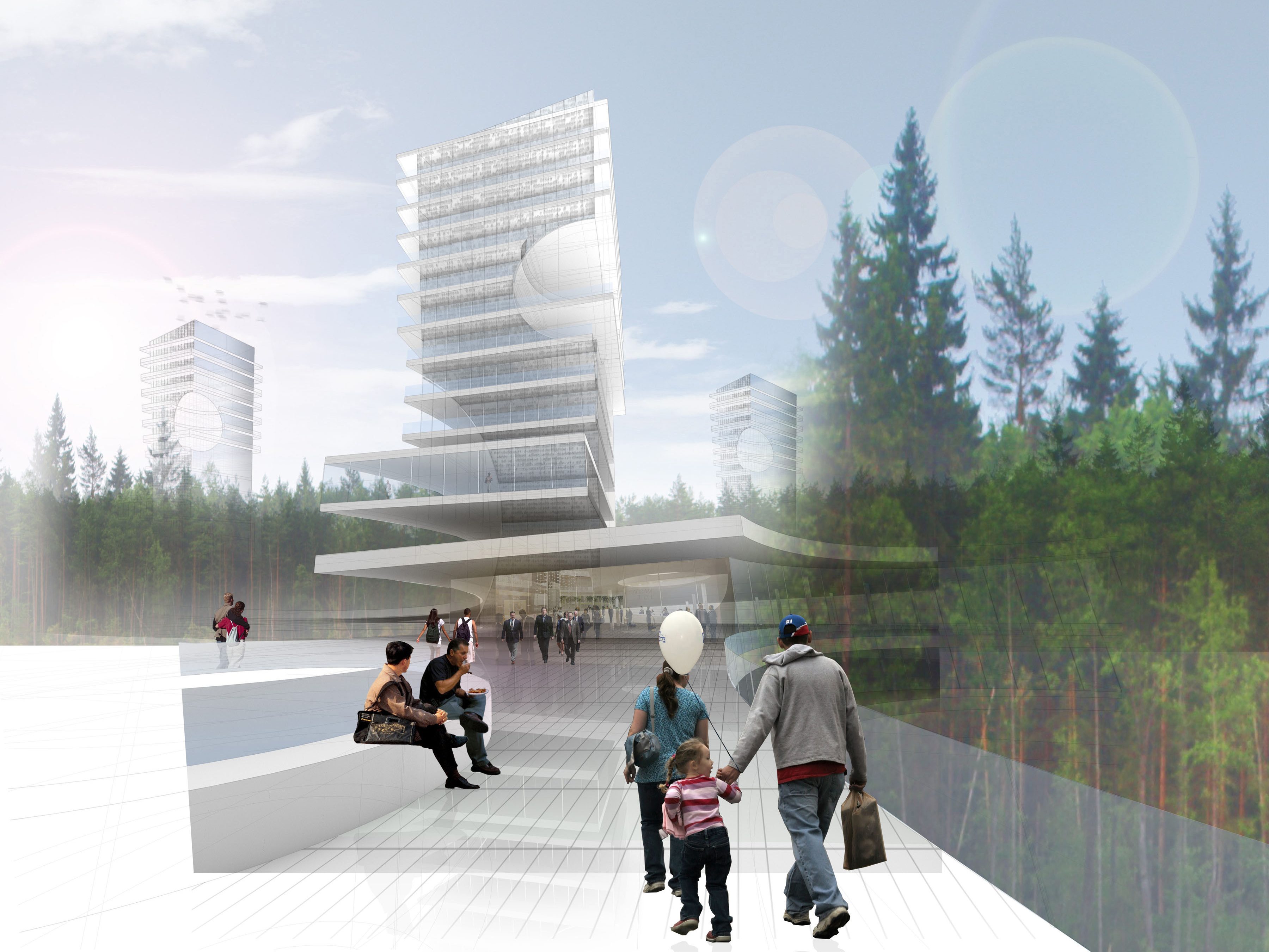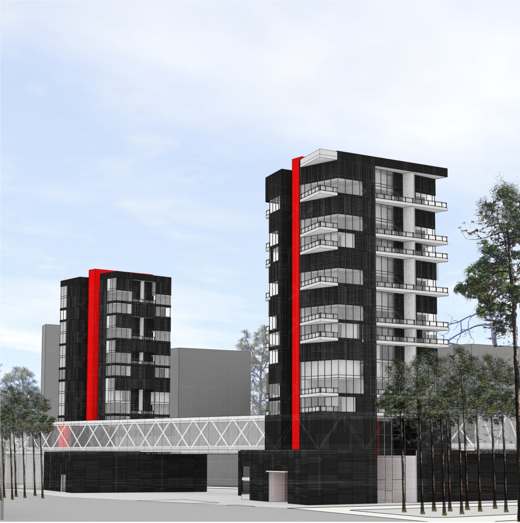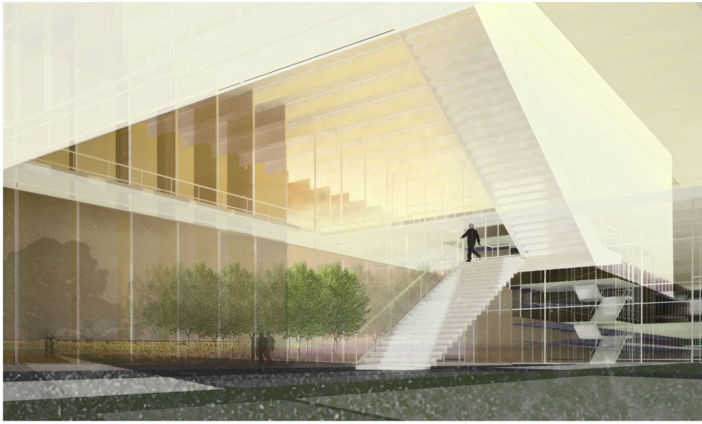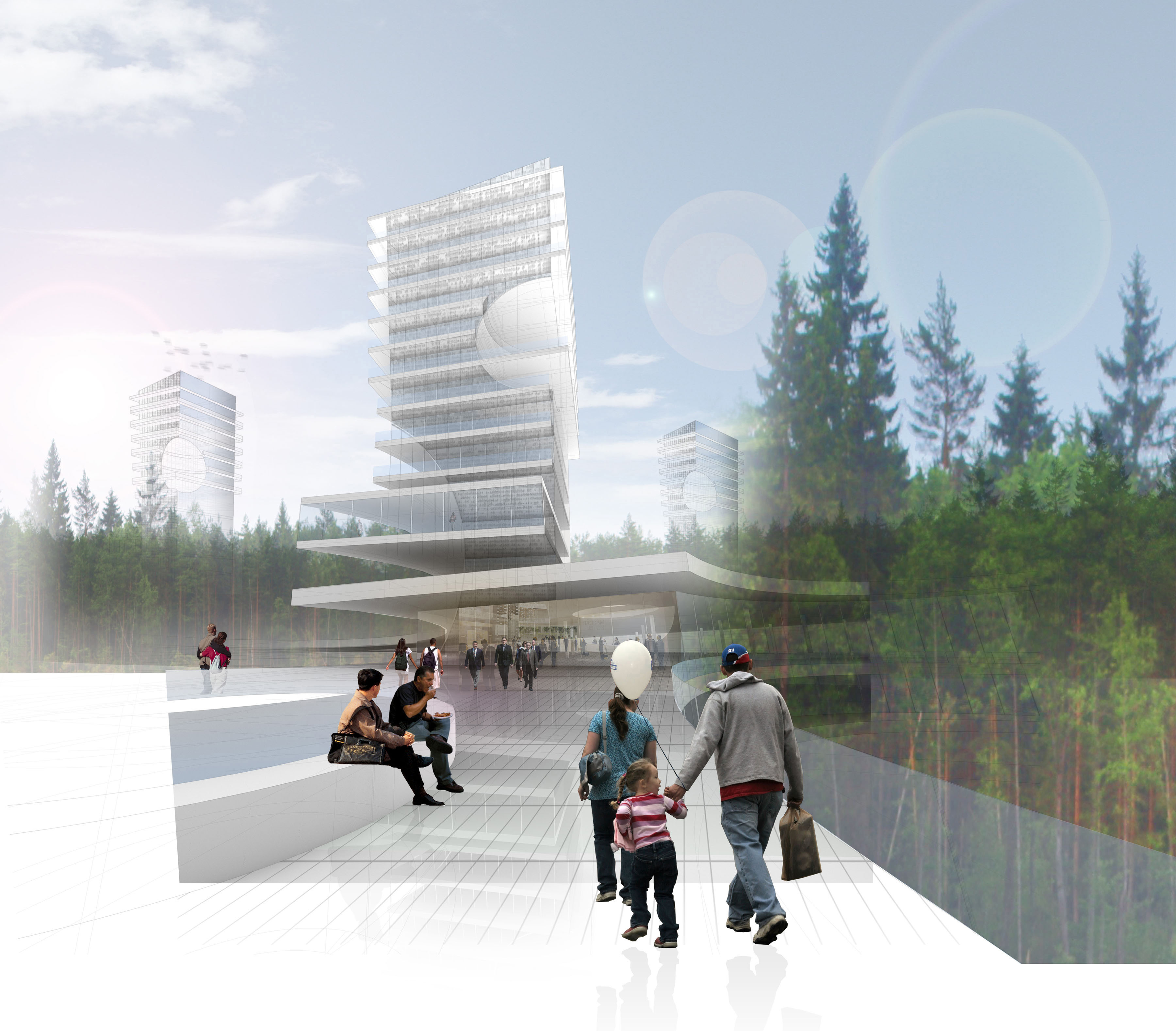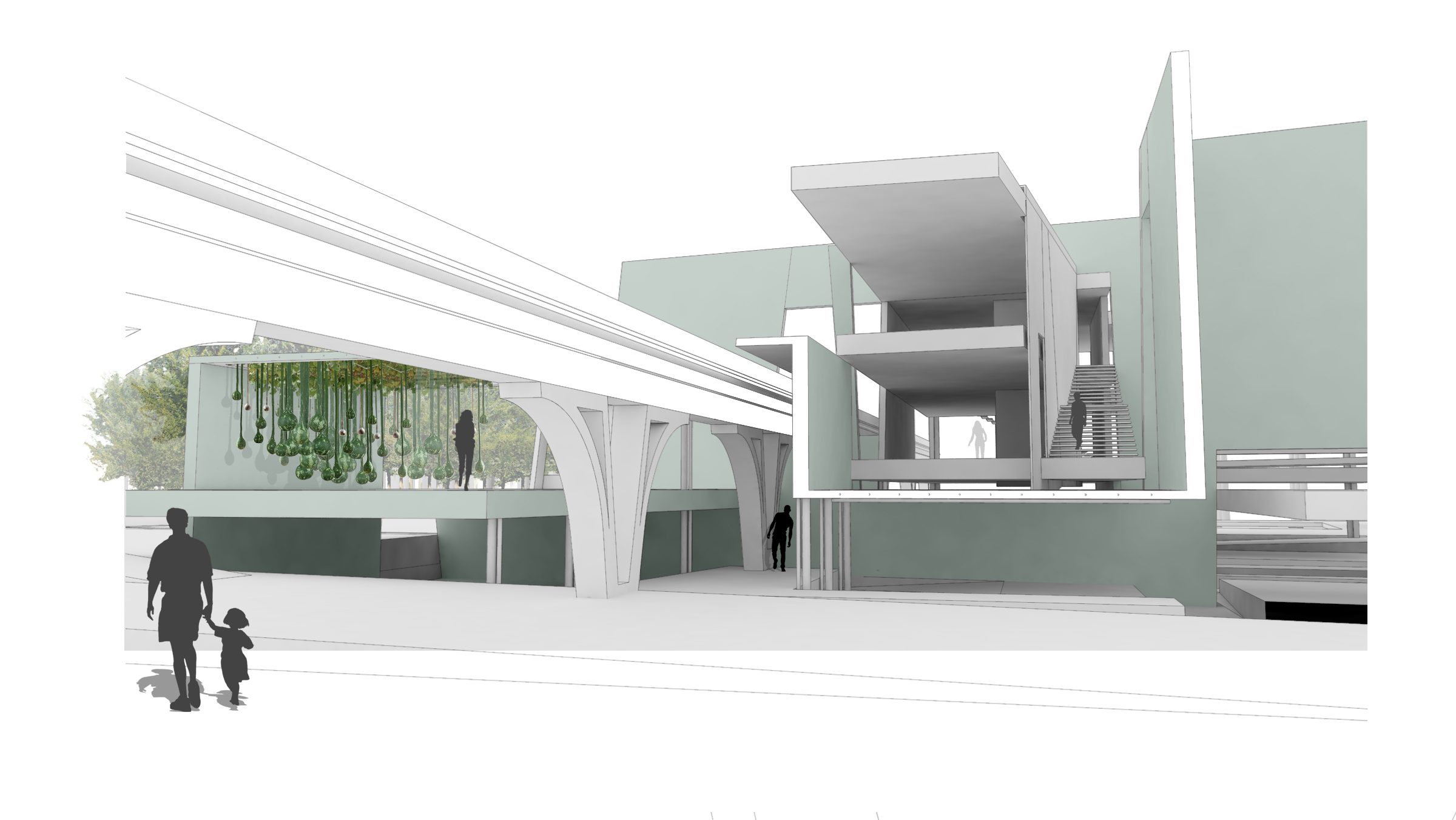 Anchored on the north and south by two residential towers, the mixed-use project has retail shops and a community theater on the first two levels. The “Flower Box” mediates the gap between the two towers, allowing for unobstructed views from the residential units to the “corridors” and serves as the catalyst for Agri-Urbanism, allowing for the production of honey in the Apiary Towers.
