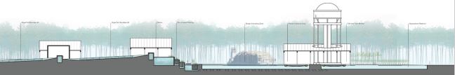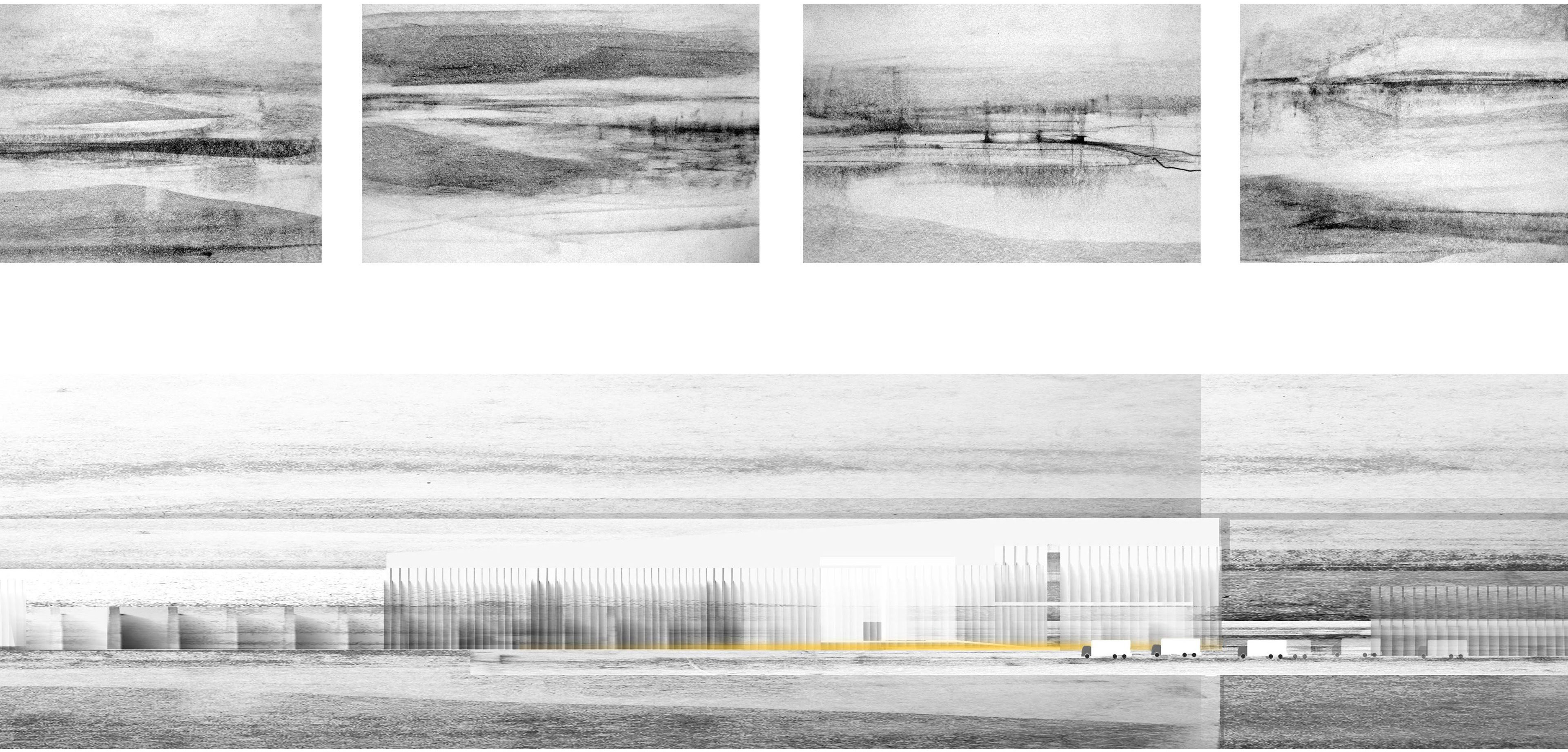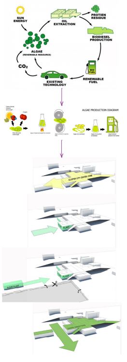 Algae pools and a refinement facility are proposed as an energy ecology in support of the Cluster Drape scheme. Simple linear pools cultivate the algae, which is collected and pressed much like olives, to get the vital oil from the algae. This oil can be used directly or refined into biofuels in a clean and quiet process to replace typical petroleum fuels. Here the refinement infrastructure is tucked under the ‘Drape’ and the pools extend out from under the elevated gardens into the natural landscape. Water flows by gravity from the gardens down into the pools rich in nutrients to grow the algae. The fuel is used for mechanical systems, heating, automobiles, and cooking.