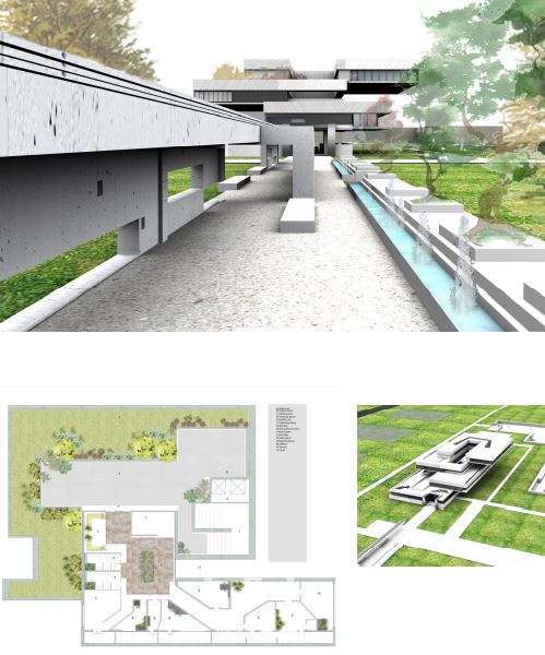 A medical wellness center offers foundational objectives for a self-sustaining and health-enriching community. Terraced gardens and the terraced architecture invoke a sense of improvement and escalation in mental health.