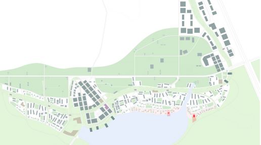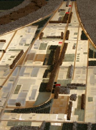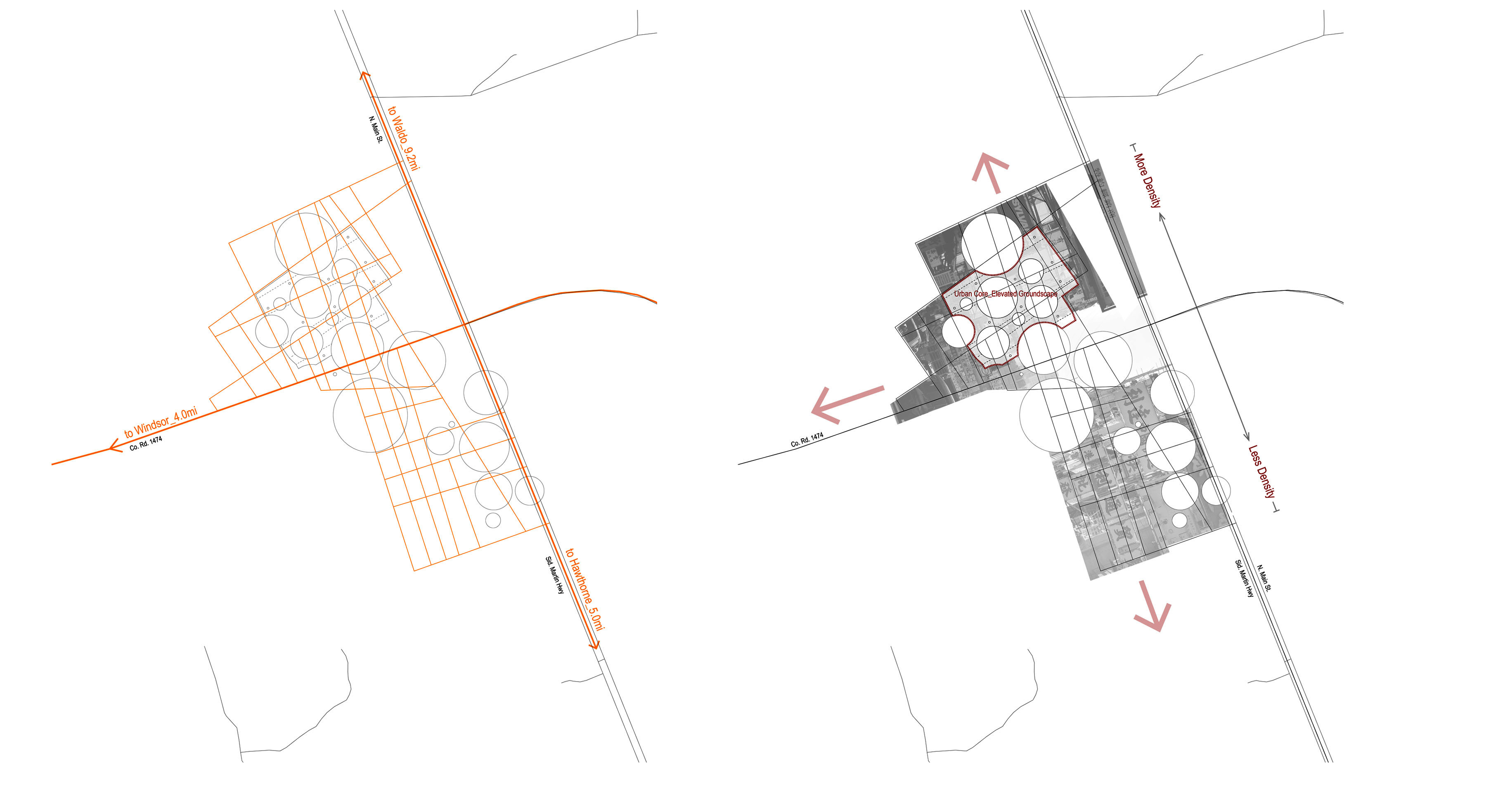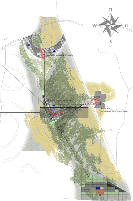 The community provides a range of built densities, the elevated landscape / urban core being the highest. As the grid separates itself from the elevated landscape, the building environment becomes less and less dense. If the community were to expand, it would focus itself along the major arterial roadways connecting to neighboring towns. The language of the circled vegetative areas would remain and grow along with built construction.