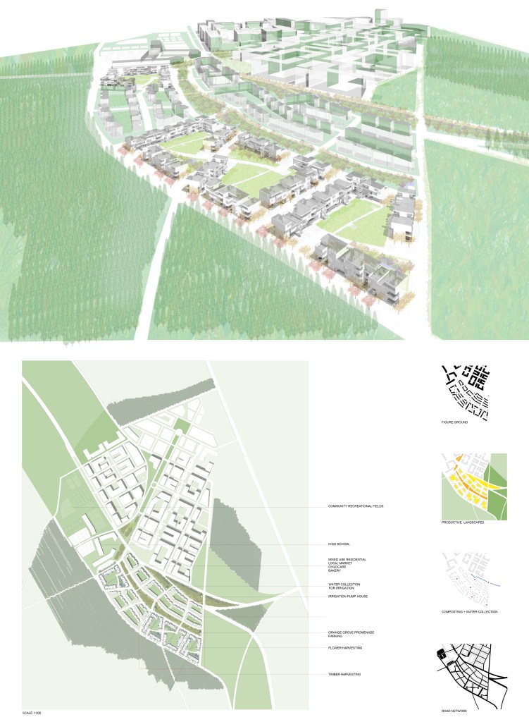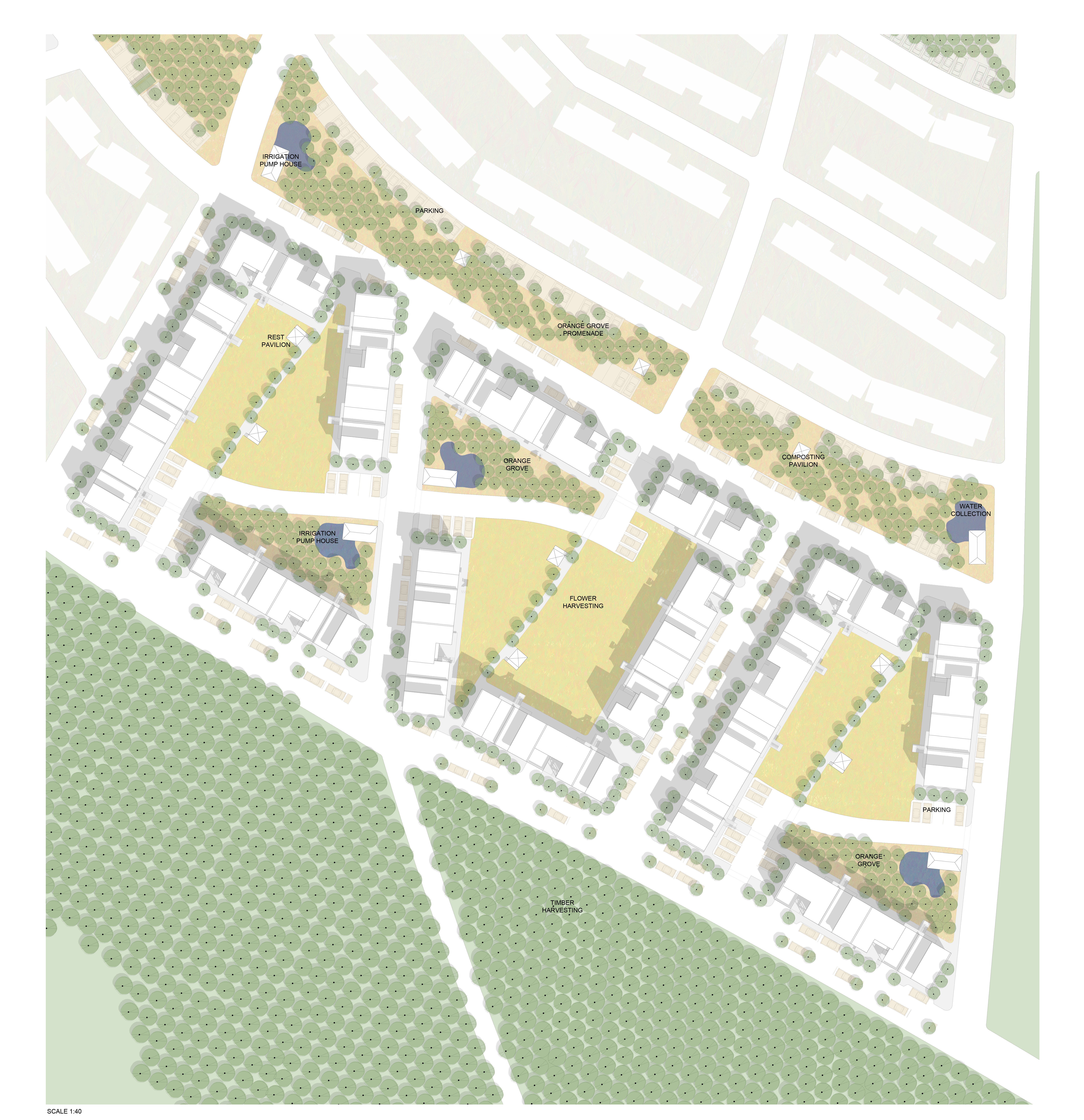 Each block is a module containing an orange grove, flower meadow, picnic pavilion, water collection for irrigation, parking, and a community pavilion for storing materials and equipment.