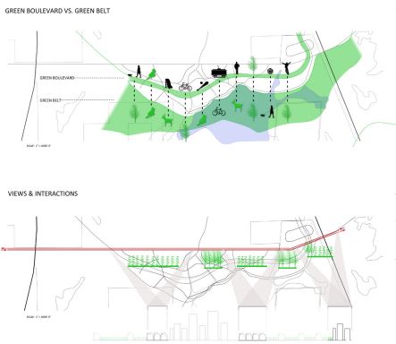 - Green Boulevard – localized strip of green that contains modes of public transit (rail, biking & running paths) other public resources, and recreational amenities.