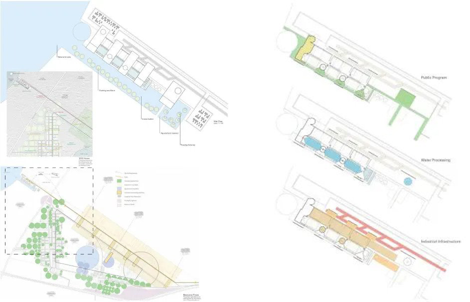 An extraction facility is proposed as both a lake remediation strategy and a resource capture process. Phosphate that is currently degrading the lake ecology is filtered and removed (mined if you will) to provide fertilizer for an industrial-scale agricultural production facility. The facility or ‘factory’ will produce fast growth mediums such as algae, sunflowers, or switchgrass that can be used for fuel, food, or both.