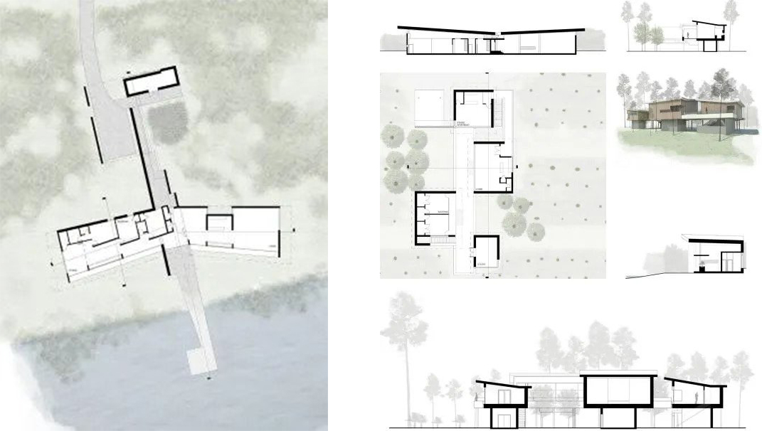 As a rural proposal, two alternatives using the same ‘kit-of-parts’ are proposed for two important contexts that emerge from the larger study. When the house occupies the edge between the forest and lake, it rises slightly from the ground to take advantage of the cooling lake breezes.