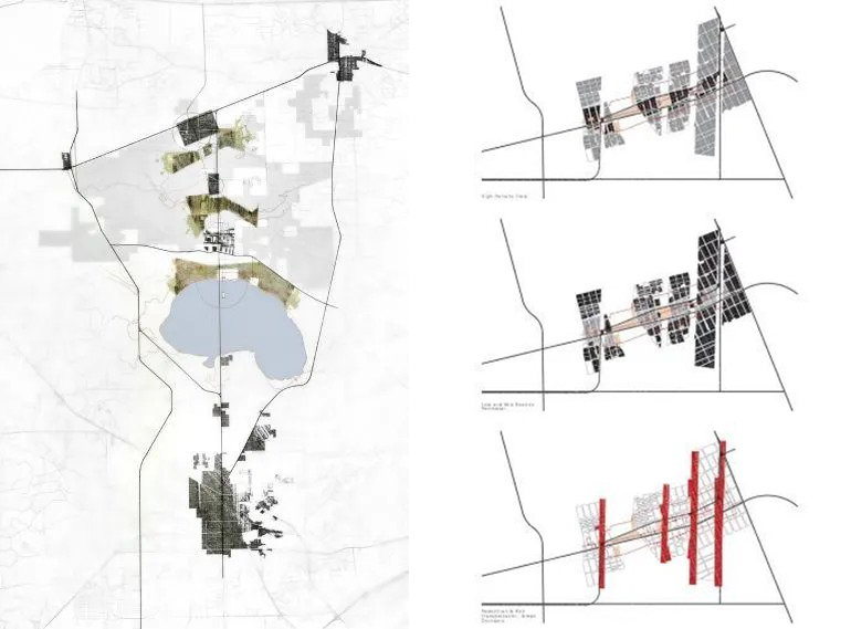 The Emerald Braid was developed around urban cores that are connected through a braid of recreational green space, productive landscape, and residential communities. The development footprint is about 1,000 acres to the east of the wetlands. It is organized as a linear corridor that is carved out of the existing site conditions