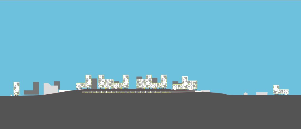 Automobiles stow in two main parking lots. A resident’s park under the housing and the public/private parking garage located under the Remand Prison. Pedestrian entry/exit points are by elevator at the Remand Prison and into/through the vertical garden (quarry).
