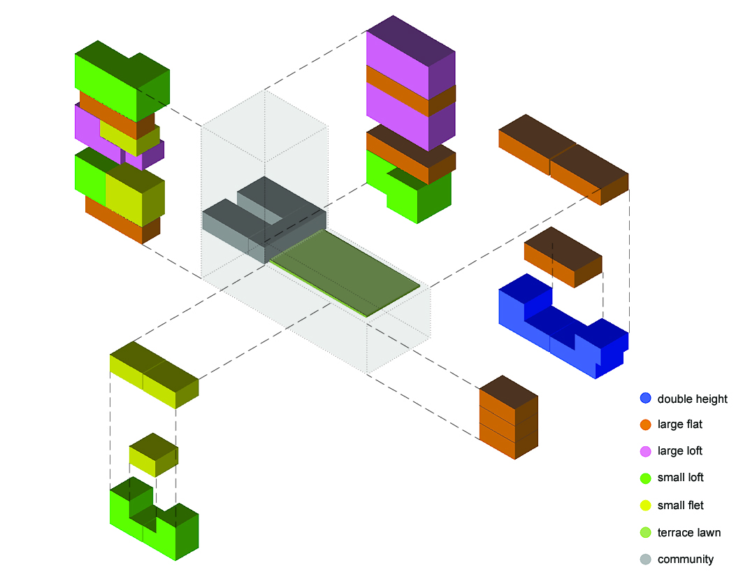 Housing, as social ecology, extends who we are and relates us to others and the world. Civilizing ecologies propose interlocking multiple scales of urban dwellings and a range of apartment typologies. This provides accessibility to persons of varied economic resources — economic poly-culture — the essence of urban living. All too often single market apartment blocks are erected stifling variety and individuality. The proposed housing ranges from 28 m2 of studio apartments to 110 m2 of urban homes. The range of unit types includes flats, studios, double-height living rooms, studio lofts, and large lofts.