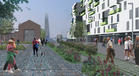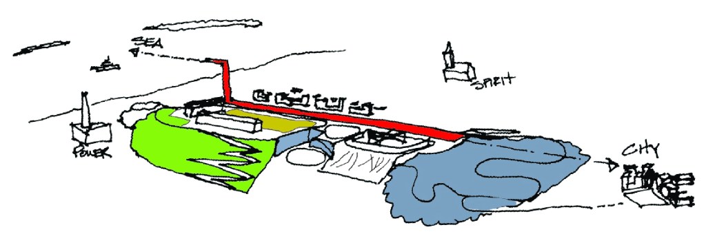 Natural ecologies are preserved and deployed on the southern portion of the site. The existing park, primarily in the southwest, is augmented with improved cycle and pedestrian connections, cleared of industrial buildings and virtually unchanged as a park landscape. A ‘vertical garden’ figuratively replaces the quarry by merely adding vegetation, pedestrian routes, walking paths, and framed observational vistas for visitors to enjoy. Rocky outcrops toward the city and sea are made accessible but not built upon continuing their dominant visual presence. Preserving these natural attributes also provides a habitat for birds, insects, and other wildlife species that in turn nurture plant life.