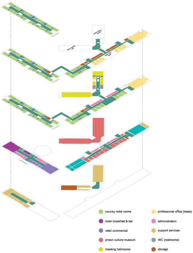 As a civic ecology, the proposed prison museum provides insights into the historic roles of transgression, punishment, and rehabilitation. Utilizing the mezzanine of the main building and lower floors of the day-night cells (preserved at this level). The museum will support the hotel to some extent and joint use of the meeting facilities provides spatial efficiencies. The existing retail and workshop building is maintained and hopefully could still operate as a prison venture with merchandise from the new prison location and/or include other retail merchandise.