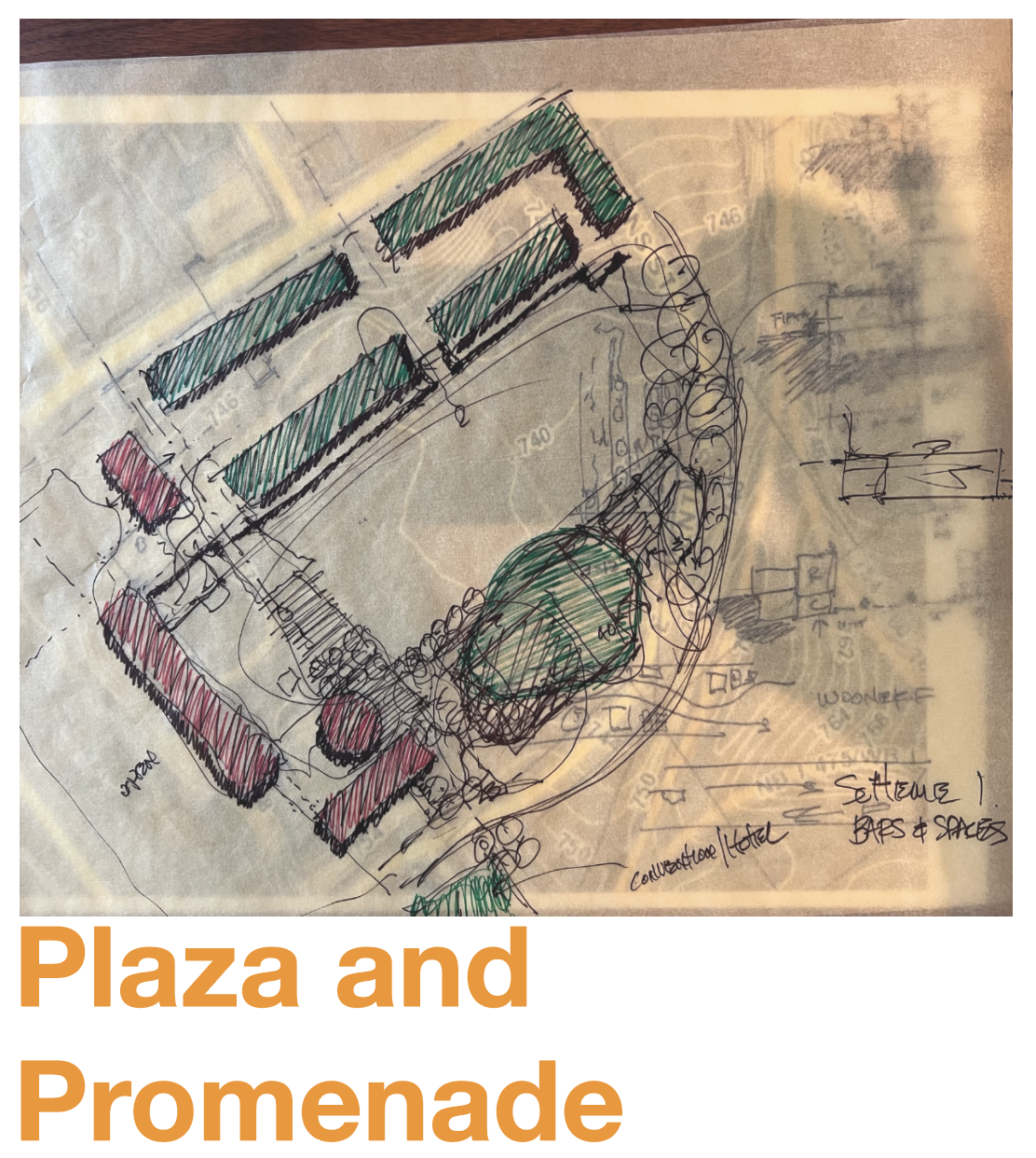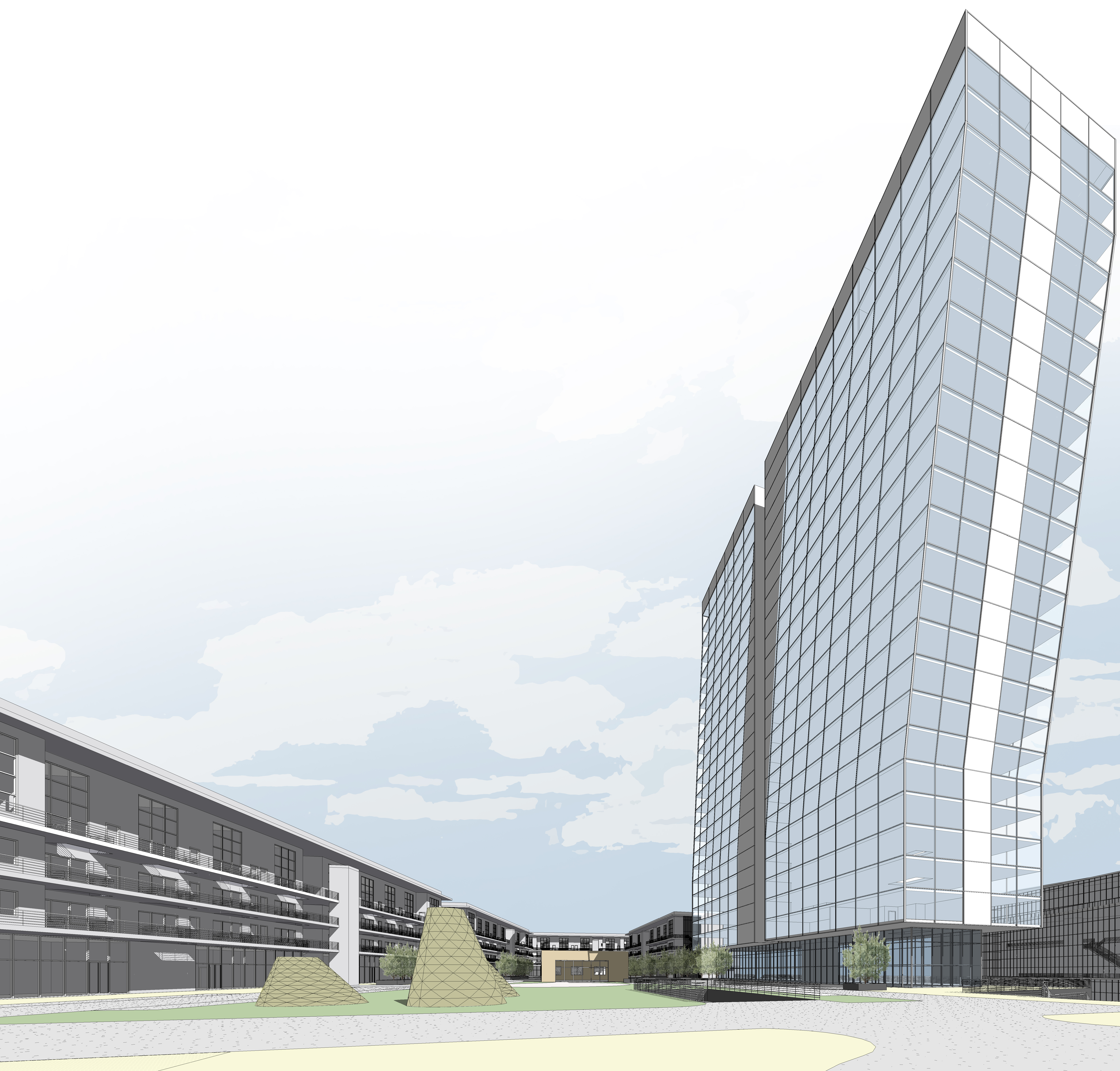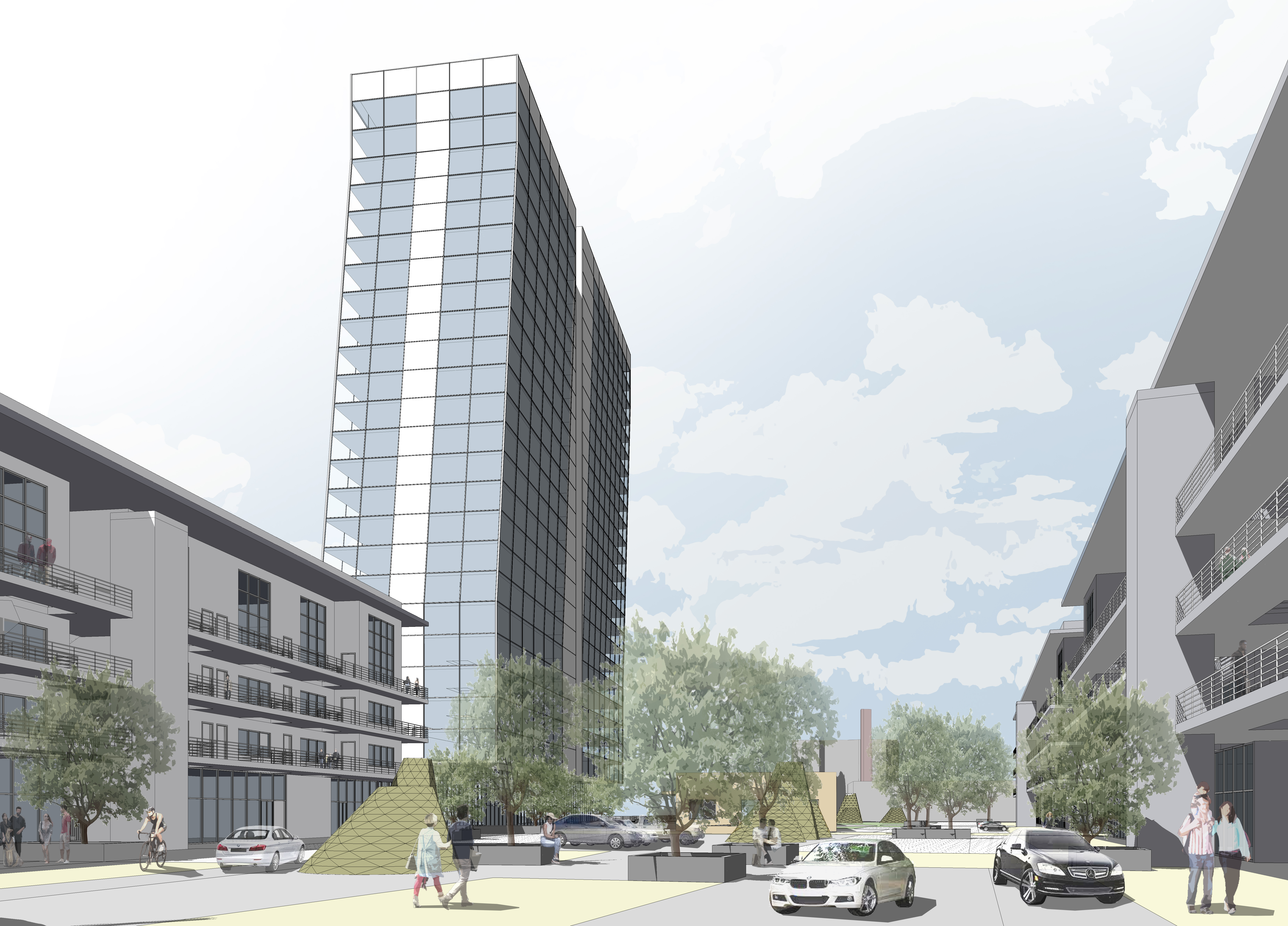 - Utilizing “woonerf” streetscape design with urban furnishings, shade, sunny spaces, and amenities to support the residents, employees, and commercial visitors to the site.