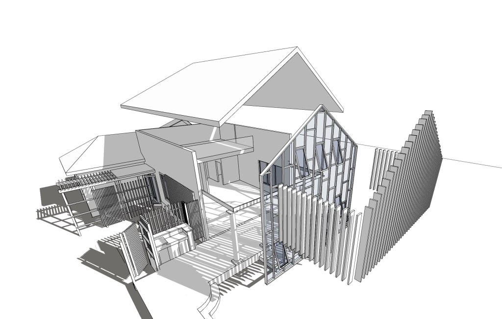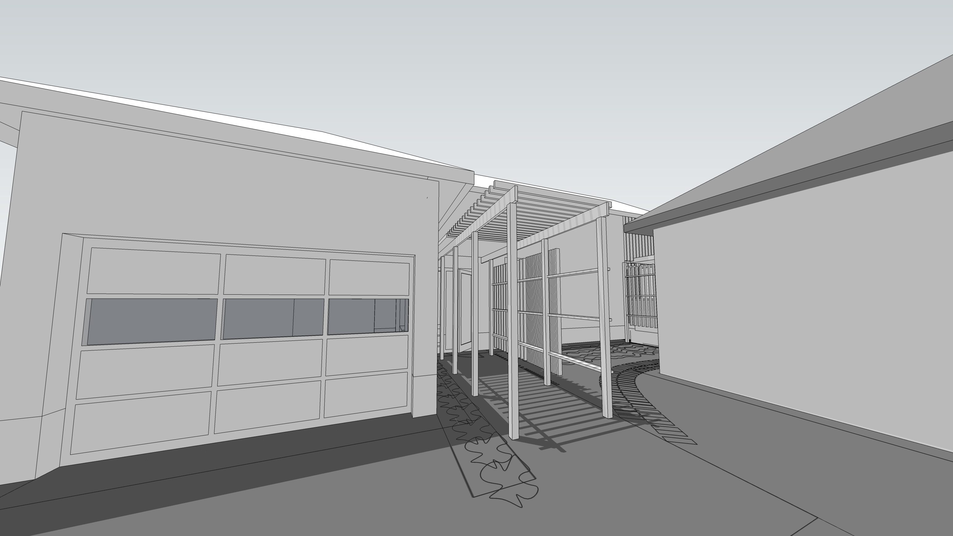 The interstitial space between the pool/guest house and the existing house is stitched with vertical and horizontal trellis elements that bring the entry in front of the garage. These allow vegetation to grow vertically in this emerging garden courtyard, defines the grill/kitchenette, and gives privacy to the entry to the guest house.