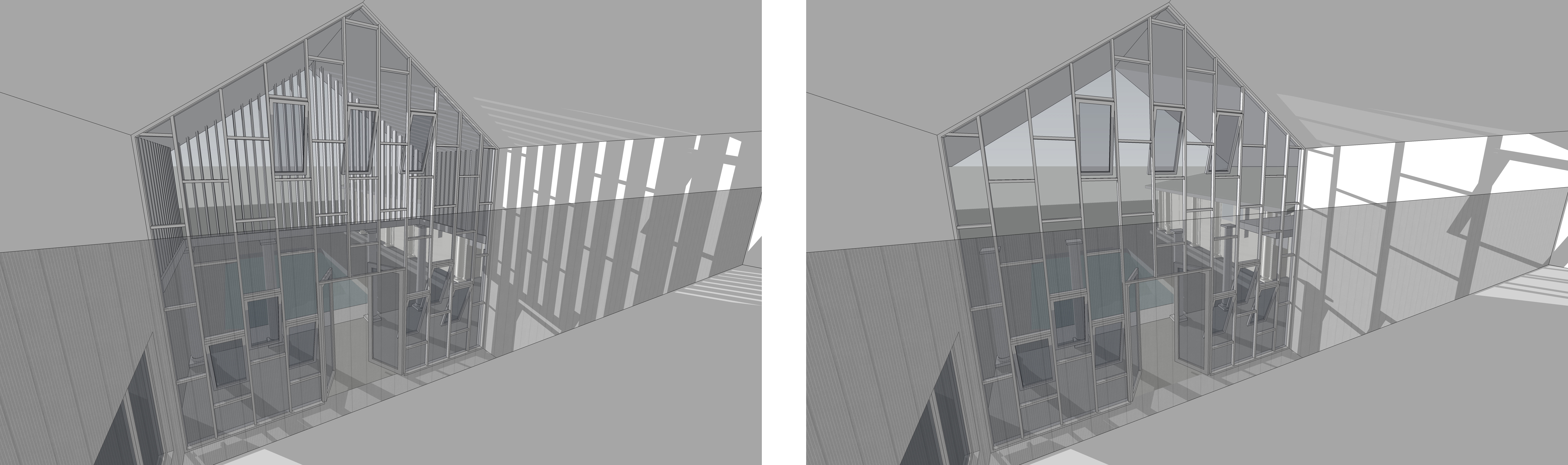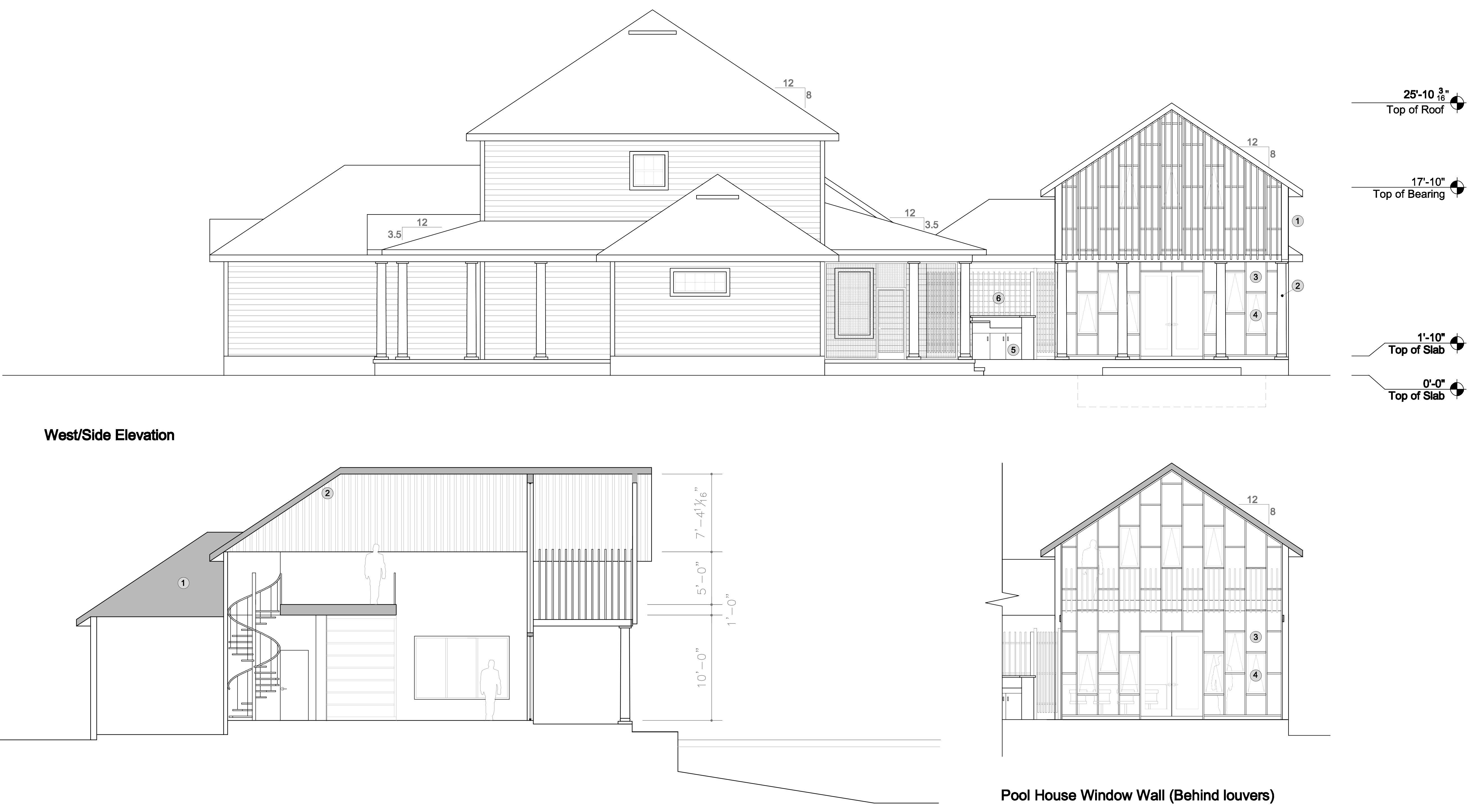 The trellis is deployed traditionally to screen and support, but is carried further through varied configurations and scales to provide the connective tissue in terms of form, shade, proportion, and linkage. On the west façade of the pool house, the vertical trellis shades the interior two-story spaces and provides a view out to the pool.