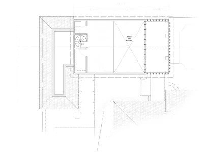 The trellis acts volumetrically to maintain the classical form, suggesting a volume being supported on the classically influenced columns that would match those of the existing structure.