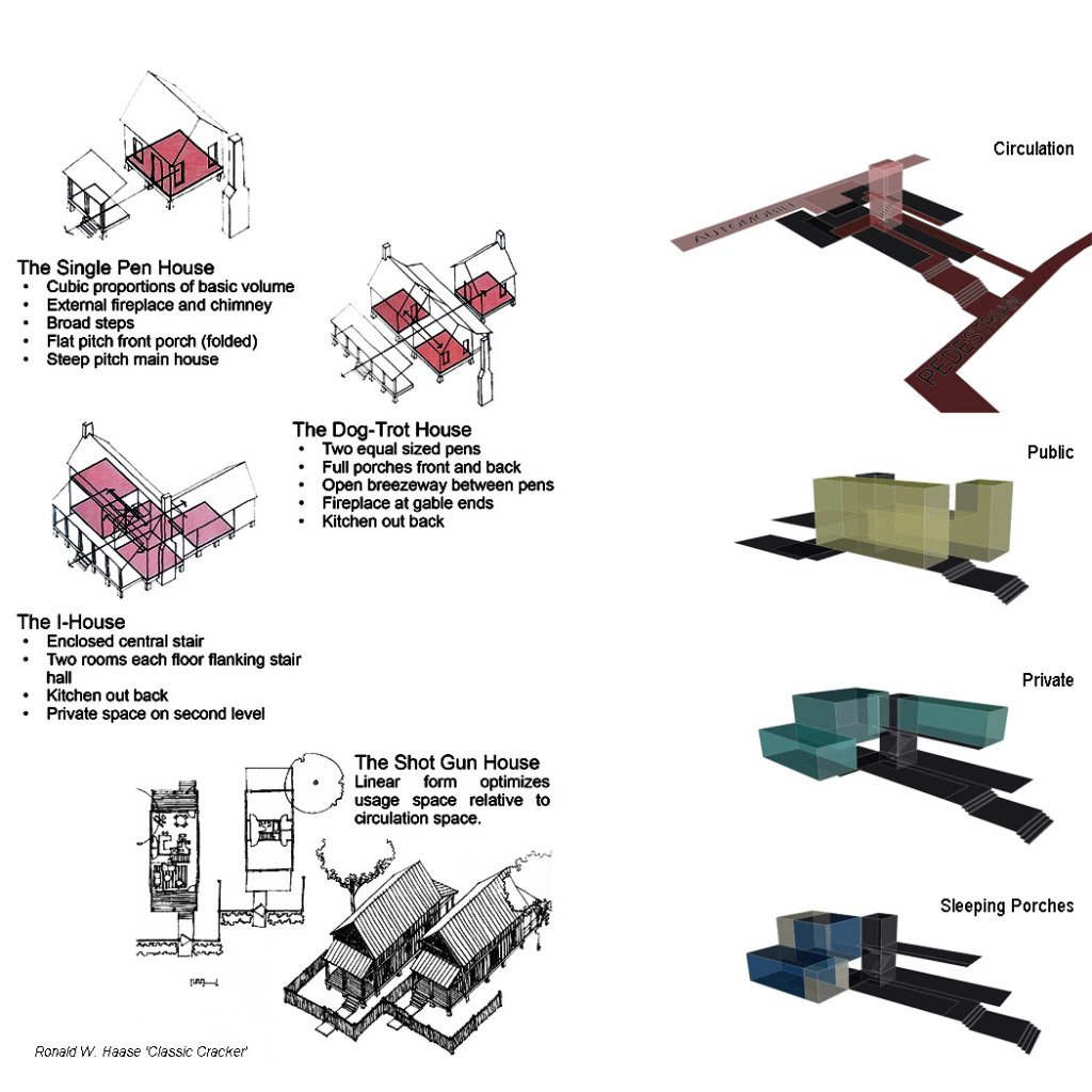 The base home is a 2,700 sqft terraced plan with two bedrooms (with sleeping porches), a bonus room (which could be a third bedroom), two bathrooms, a double-height living room, and double-height dining room, kitchen, and a large two-car garage. A variety of porches are provided.