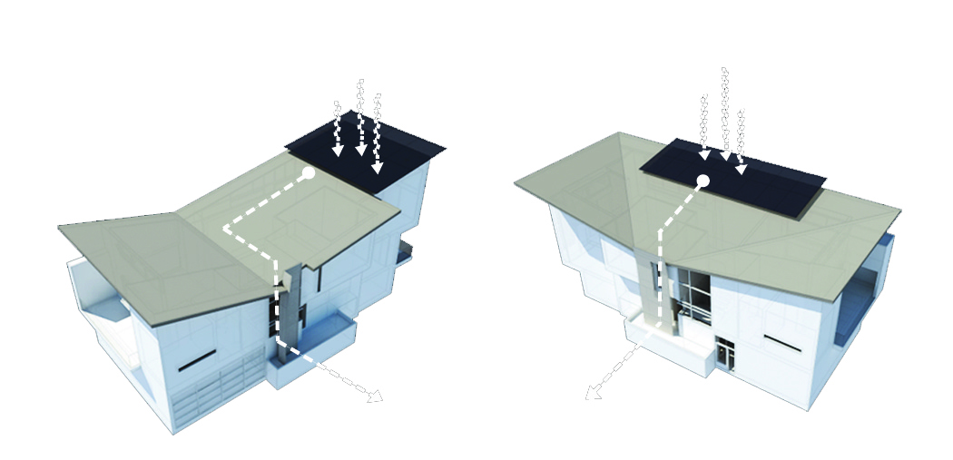 The Two-fold roof is deployed on homes in which the long axis is oriented east-west (front faces east or west). The two-fold strategy slopes the roof toward the south to optimize solar panels while also directing water, as a harvesting catchment, toward a central collection point for conveyance to the cistern — no gutter cleaning is required.