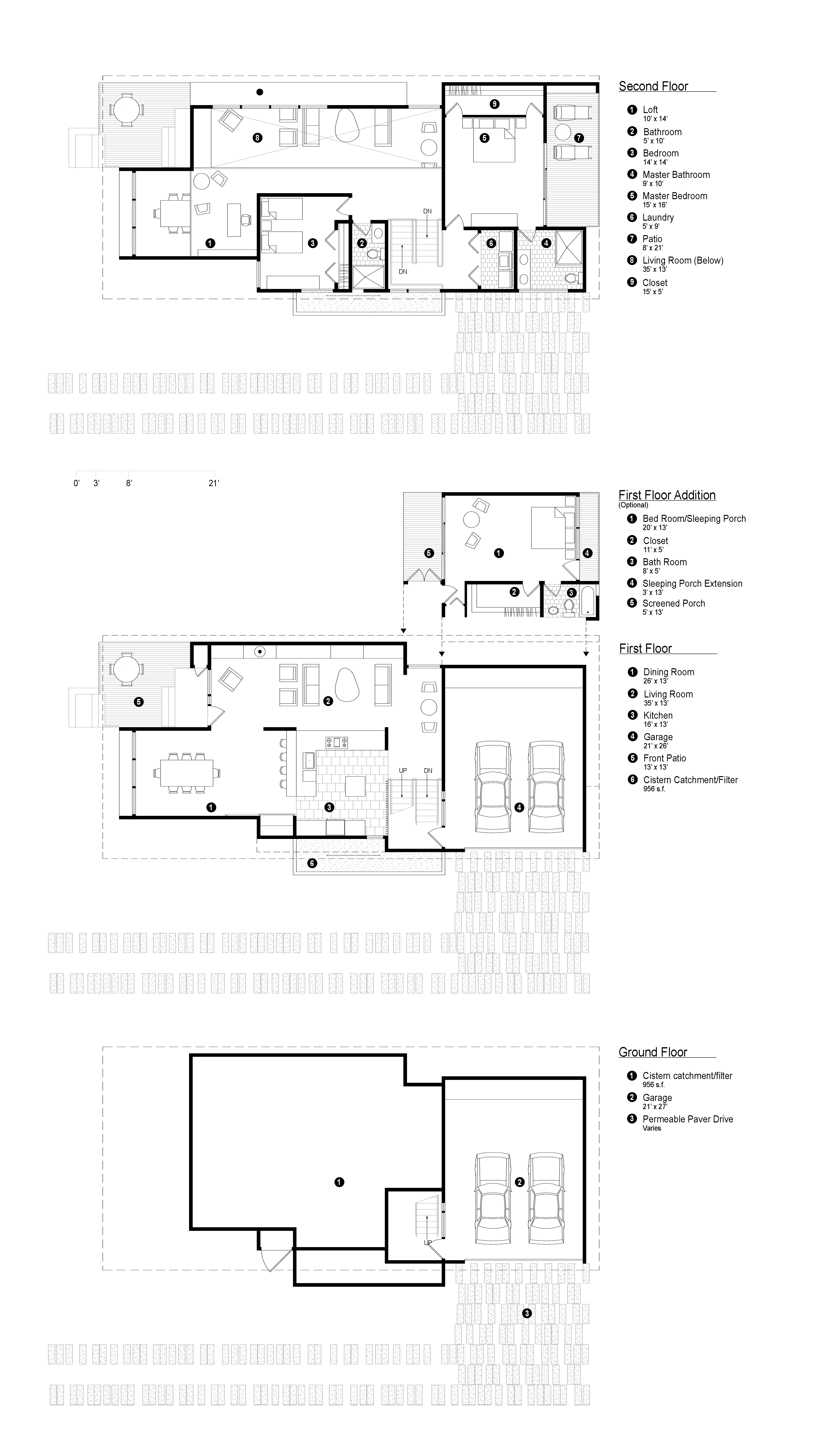 The base home is a 2,700 sqft terraced plan with two bedrooms (with sleeping porches), a bonus room (which could be a third bedroom), two bathrooms, a double-height living room, and double-height dining room, kitchen, and a large two-car garage. A variety of porches are provided.
