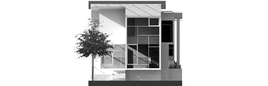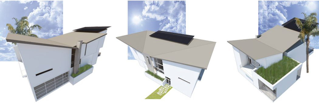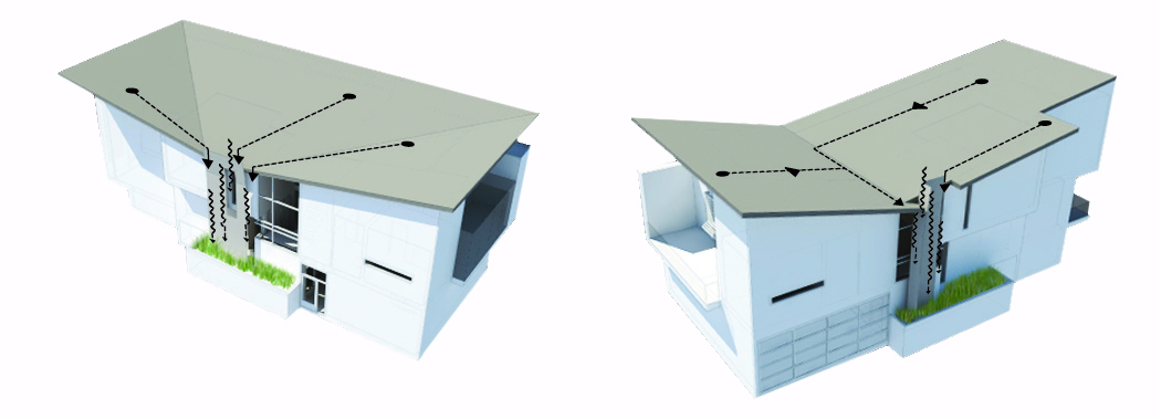 The Butterfly roof is deployed on homes in which the long axis is oriented north-south (front faces north). The slopes optimize solar orientation while directing water, as a harvesting catchment toward a central collection point for conveyance to the cistern — no gutter cleaning is required.