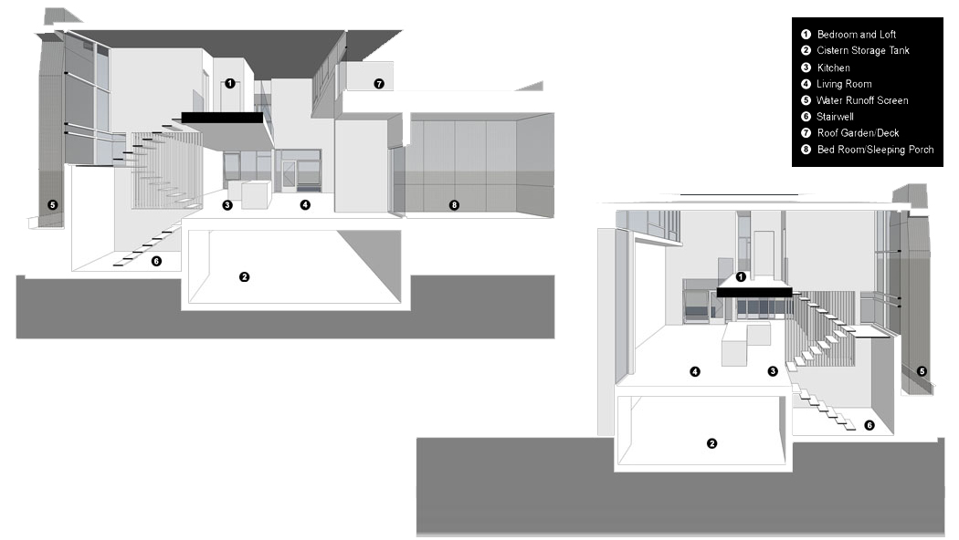 - Lite House employs a terracing strategy to celebrate and resolve four fundamental design strategies: elevate the house to optimize hurricane resistance; provide space for a large water storage cistern at grade; minimize long stair runs (typical of coastal construction), and stack spaces to achieve a small footprint.
