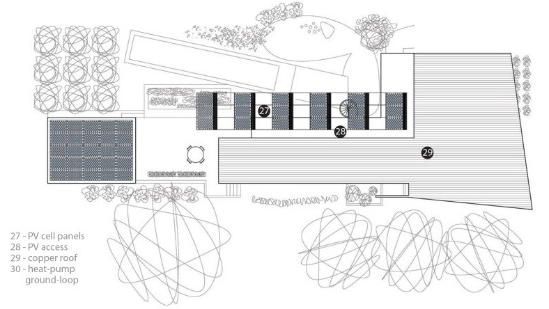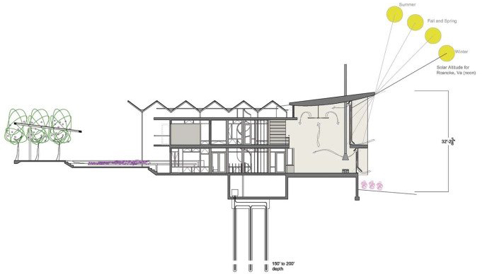 The panels are deployed to shade east-facing openings in the mid-morning and the court in the afternoon. A ground-loop heat pump is deployed for heating and cooling during periods when architectural strategies will not meet environmental stresses. Of course, all high-efficiency appliances with low embodied energy, limited toxic containment and outputs, and high recyclability would be selected.