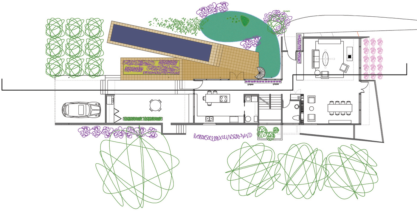 Rather than rely solely on constantly advancing technological gadgets, Meta-house engages traditional ecological strategies that connect to and moderate, rather than separate us from the environment. Appropriating the high maintenance suburban lawn, Meta-house establishes fruit and vegetable polycultures to not only provide edible nutrients but also to absorb and recycle biomass waste outputs. Peanuts, from landscape shrubs, can provide as many nutrients and twice the calories per pond as sirloin steak.