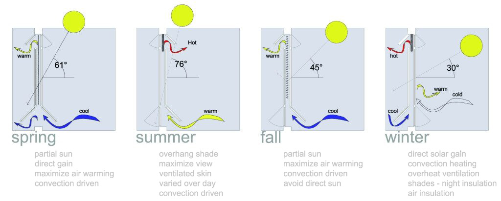 The southern exposure allows direct solar heating of the space during the winter and shade from the sun during the summer. This natural energy flow is maximized by the double-skin window systems. Simple recycled glass without expensive coatings can be used. Strategic manipulation of these architectural systems provides optimal passive moderation of the interior comfort over a range of exterior conditions. Like seasonal clothes, this activity registers in the façade of the park enlivening the civic space.