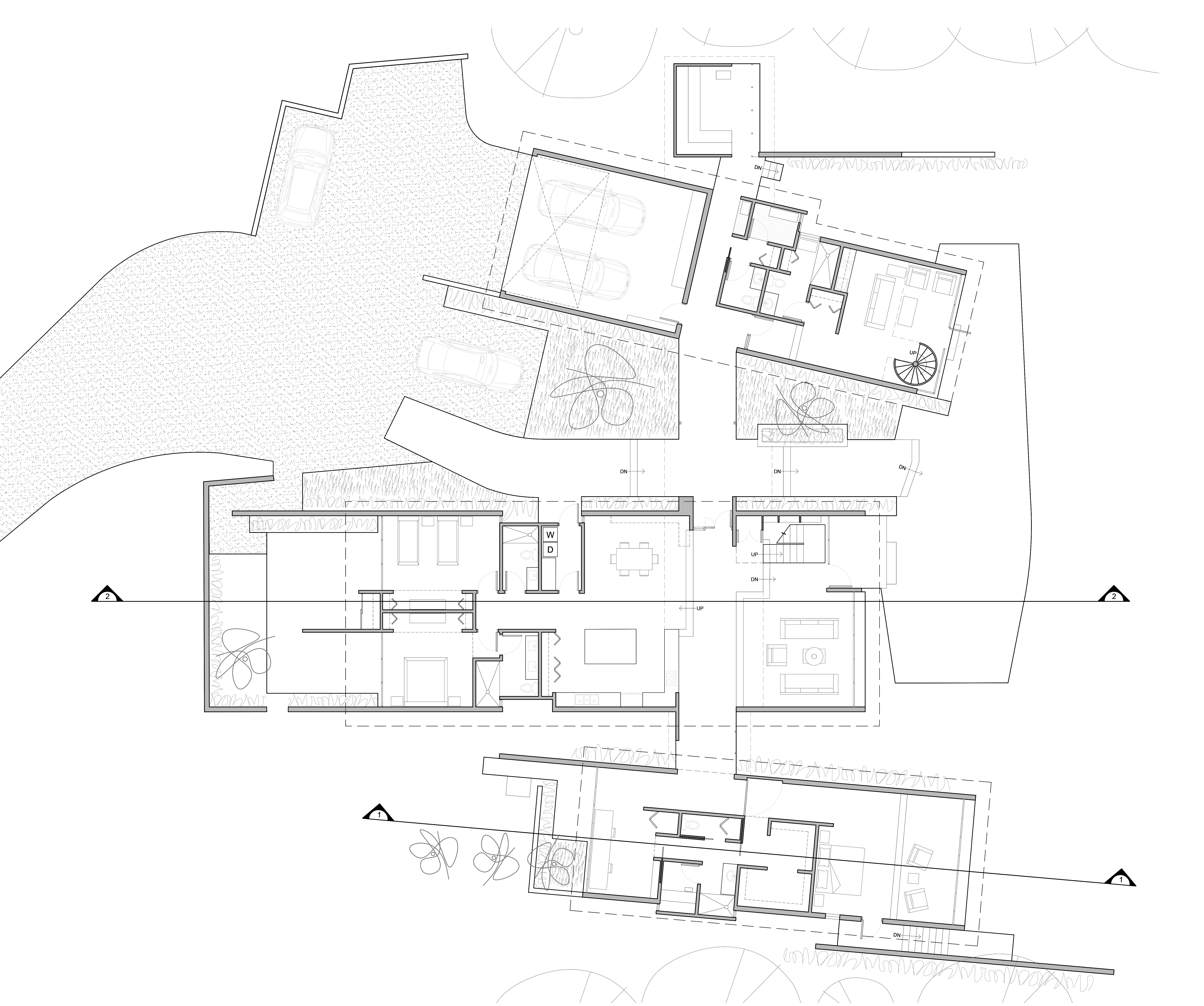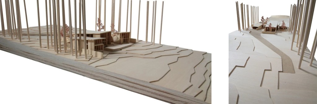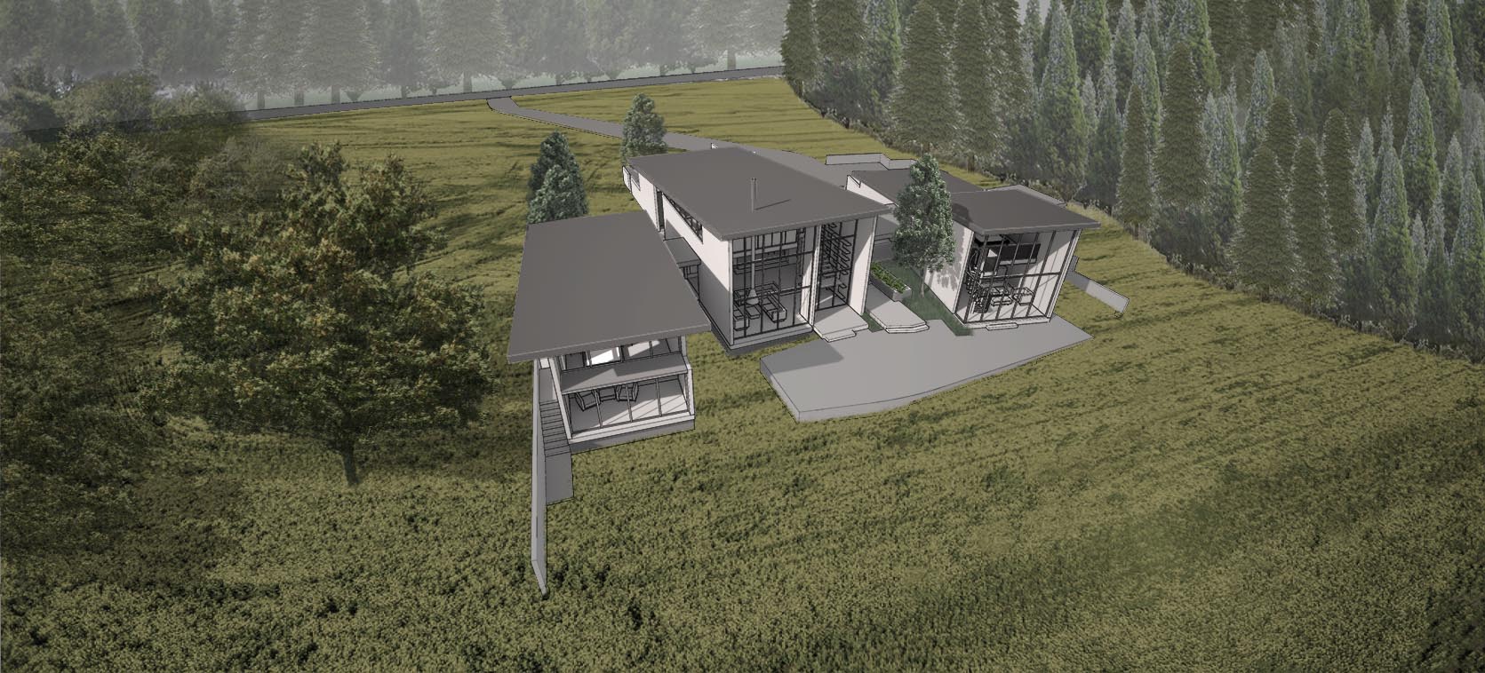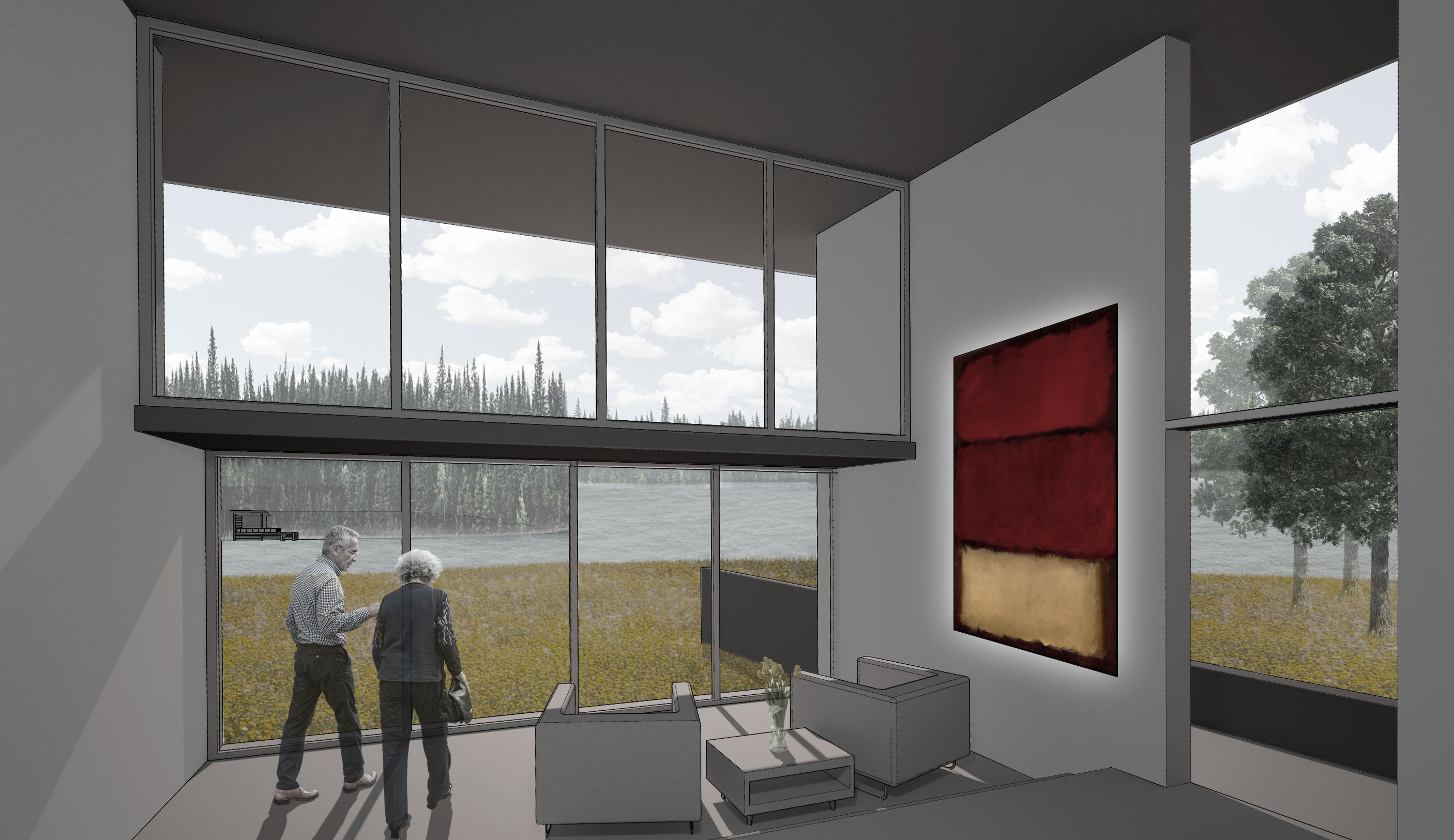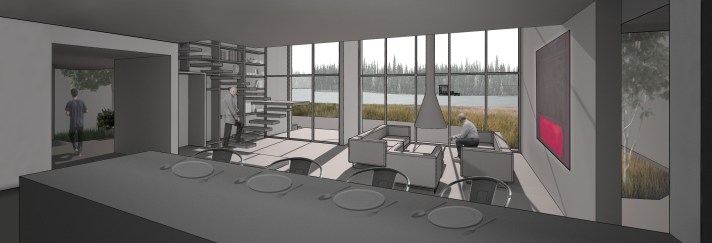 This strategy preferences the views from each of the three structures as both individual and collective while the interior terracing allows views from multiple rooms. The proposal offers a low profile to the harsh winter winds along with high privacy from the rural access road. The windows are gathered toward the views with high insulation walls at other locations as a highly effective strategy in terms of reducing energy use without sacrificing connectivity to the natural site amenities. The low slope and simple form of the roof is specifically designed to hold snow as an insulating material during the winter months.