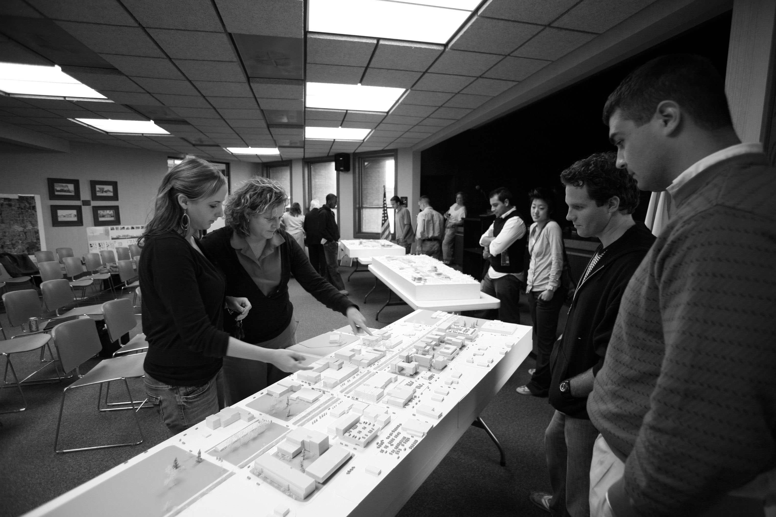 Each team is developing an analysis/ strategy for urban design and downtown redevelopment that includes urban sections, urban plans, physical scale models, and electronic models. The teams will focus on optimizing vacant land, identifying buildings for restoration/adaptive use, linking the two sides of the railroad track for improved pedestrian crossing, developing quality civic space, integrating parking (grade and garage), and locating key commercial anchors such as a hotel and retail establishments.