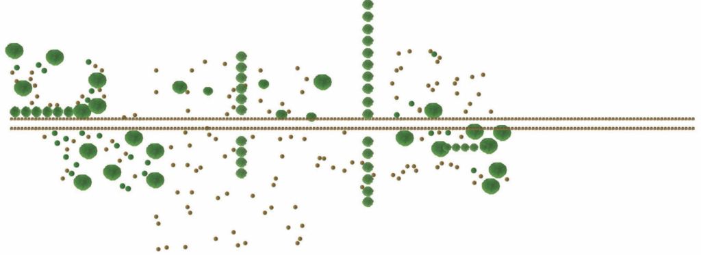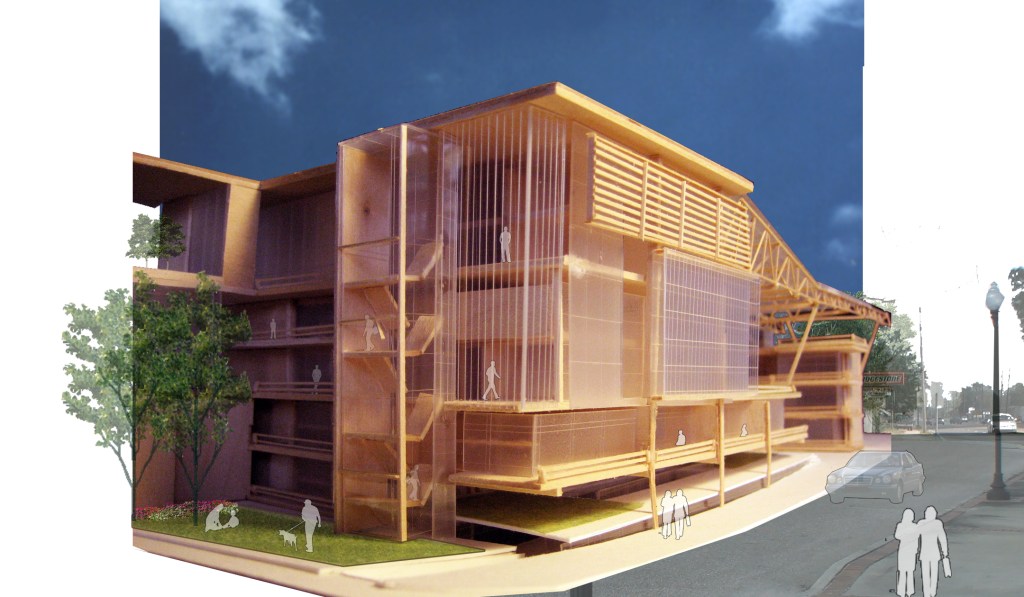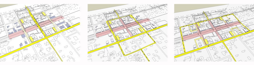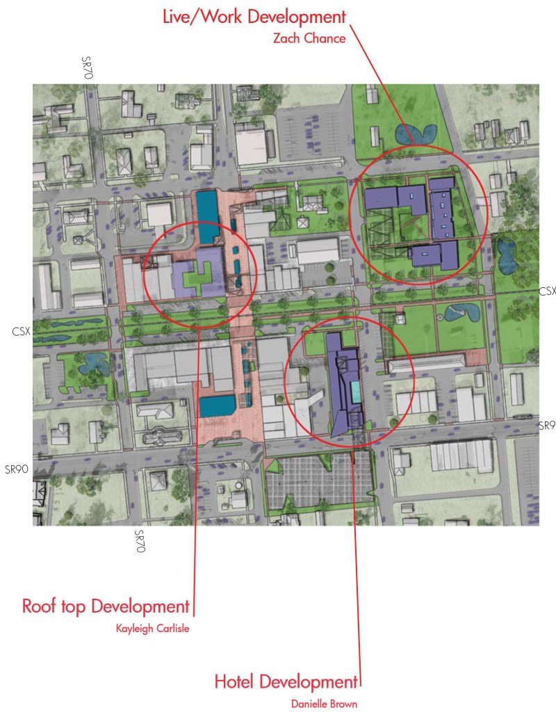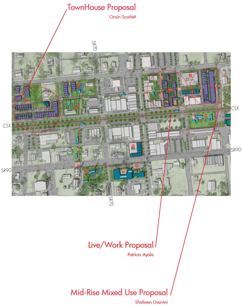 The projects developed within this scenario take advantage of connectivity to the railway as linear green space while reconciling adjacency to the pedestrian mall and auto-dominated streets. Varied programs including hotel, apartment, and mixed-use try to optimize the opportunities generated by relocating SR 70.