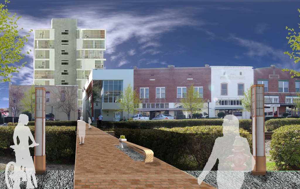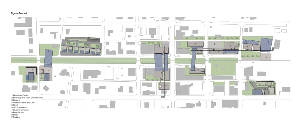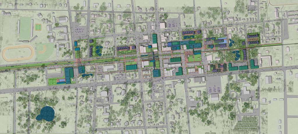 Our preliminary work focused on addressing the primary concerns as noted above in addition to linking the downtown to regional amenities, developing a sustainable infrastructure (power generation and stormwater filtration/ reuses), providing needed shade in the downtown, capturing residual space for commercial (revenue-generating) uses and developing a unifying syntax for urban design to integrate the quality historic buildings with new buildings that would be affordable and integrate sustainable construction methods and materials.