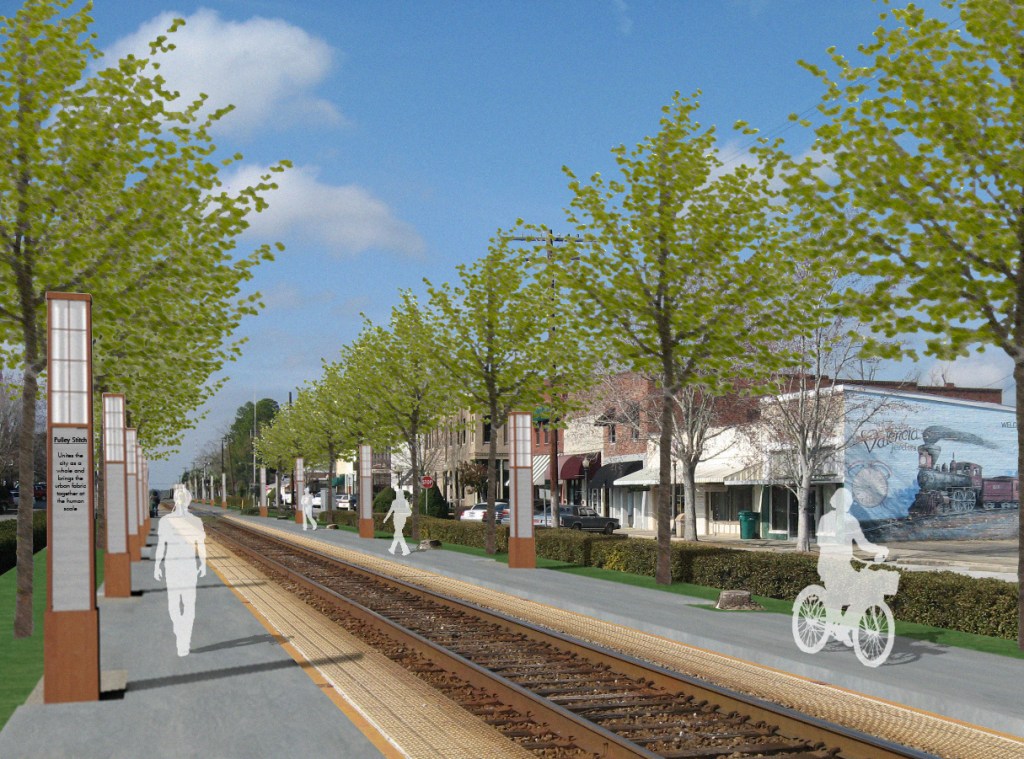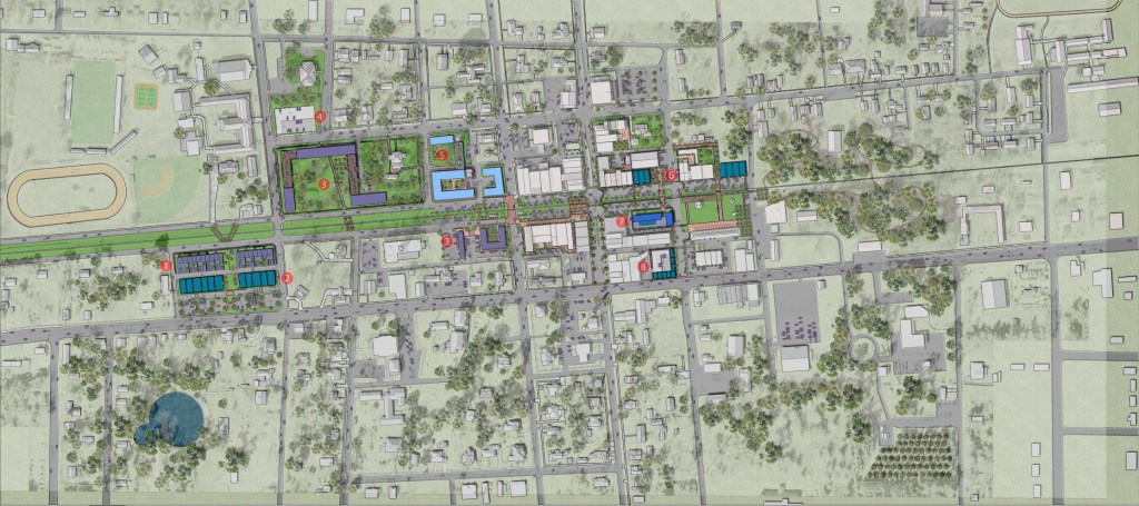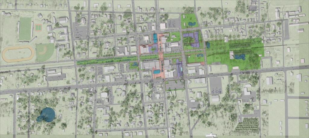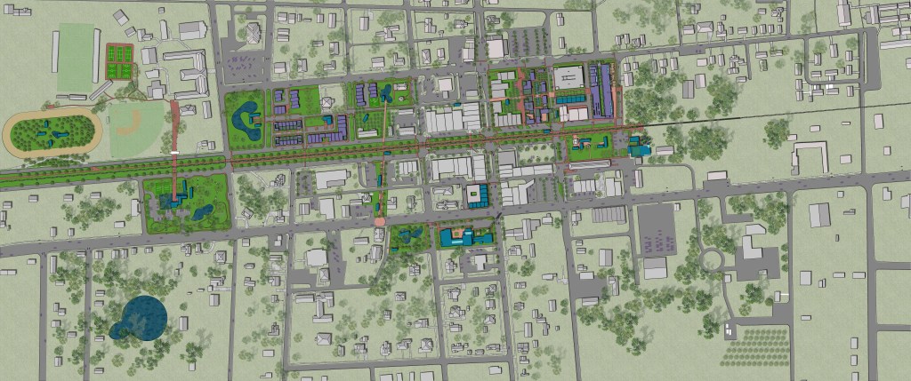 This scheme emphasizes the lineage and heritage of the railway as a core element in downtown Chipley while deploying strategies to make connections (sutures) across the spatial gap that the track creates the downtown.