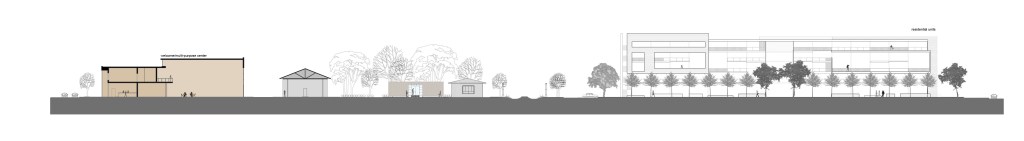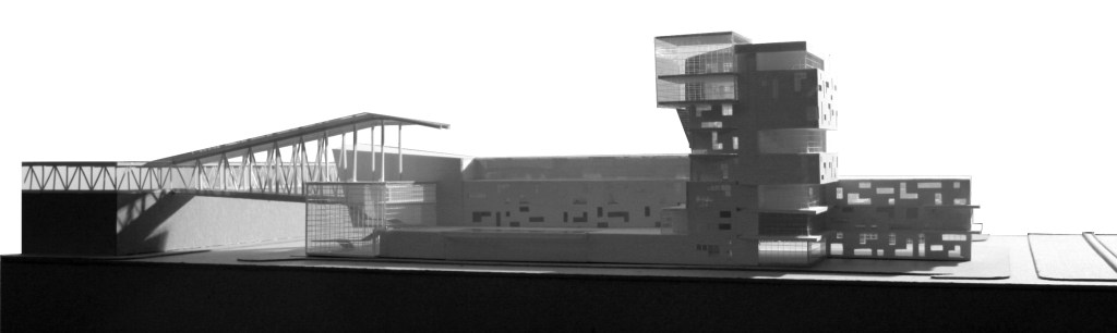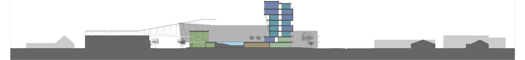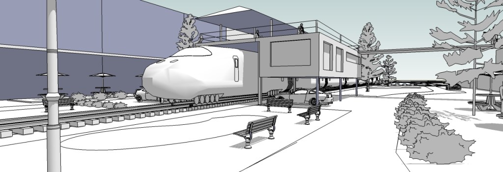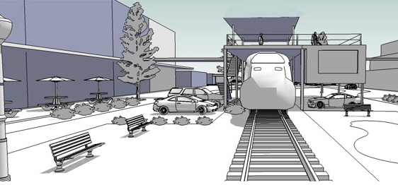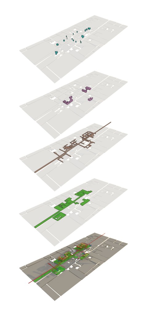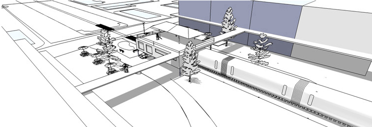 Strategies include the location of important program elements on either side of the track with connective open spaces that link across in conjunction with streets as well as at pedestrian-only locations. These strategies provide the opportunity to make ‘short cuts’ and occupy exterior spaces that improve pedestrian connectivity. Furthermore, a railroad/cultural museum housed in ‘boxcars’ is located in the urban fabric along the railway that could provide a historic itinerary through the downtown — downtown as a museum.
