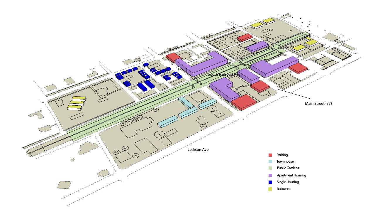 The schemes take slightly different approaches toward capitalizing on the present amenities such as the CSX railroad that splits the main street downtown (a true railroad town); the historic fabric and scale of the early 20th Century buildings, and the pedestrian-orientated core fabric; and the available vacant land in the downtown.
