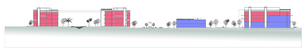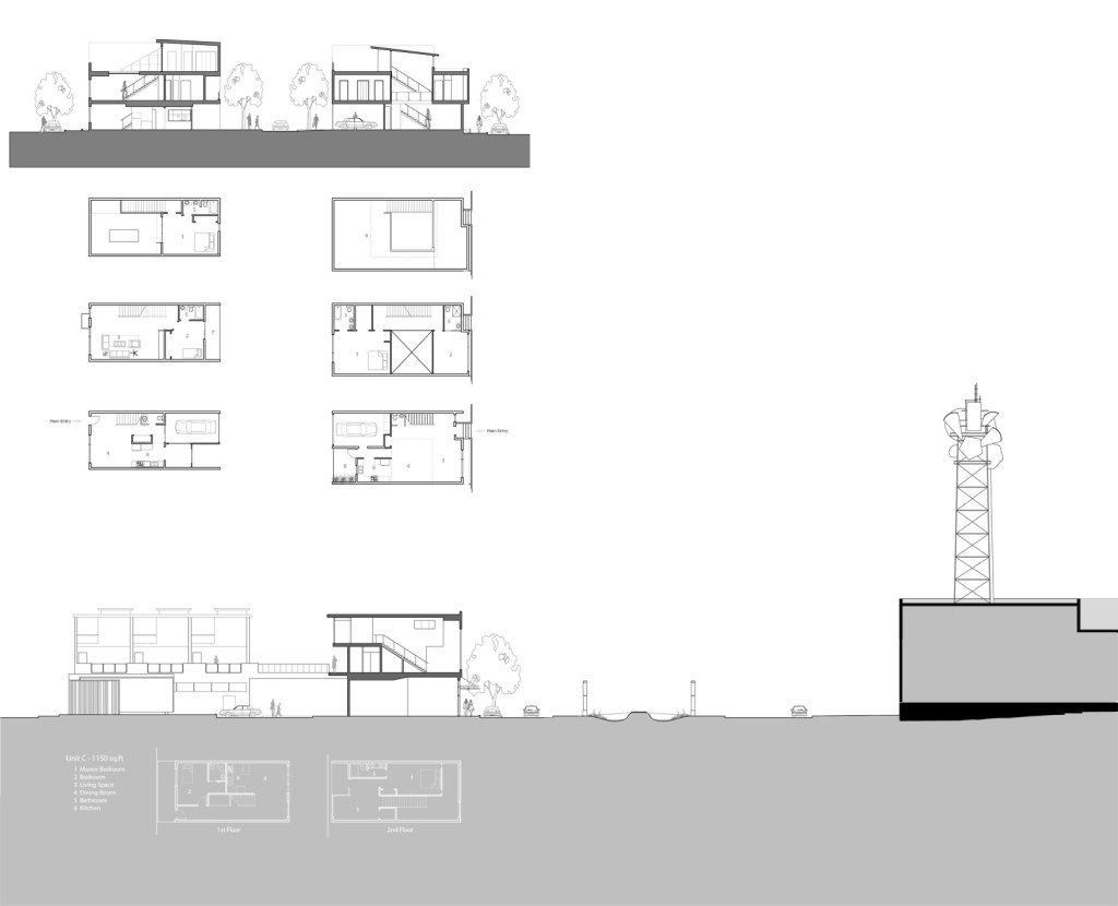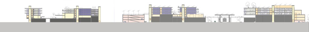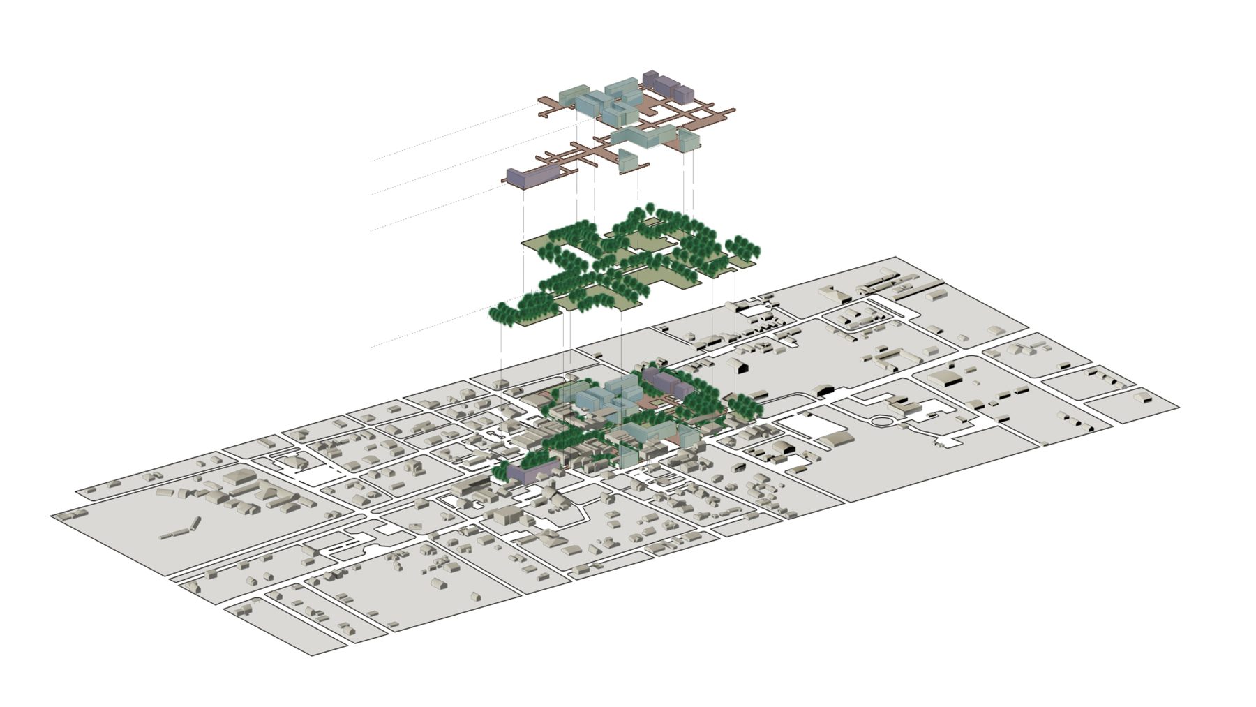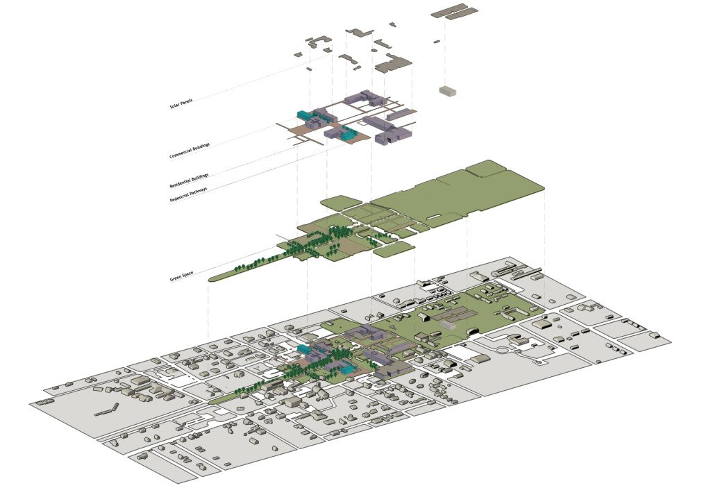 As an infrastructure, the system is completely expandable and able to accommodate both private and public investments. Green space is layered with the Photovoltaic elements as a system of PV canopy, tree canopy, hardscape, greenscape, and wetscape. Existing natural areas are connected to the core through a system of parallel linear parks, with adjacent row houses, low rise, and mid-rise housing.