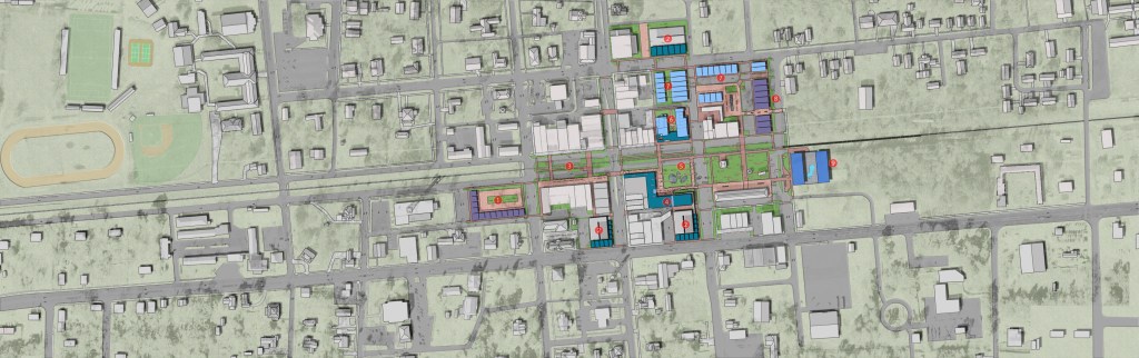 The Street system was a balance of efficient circulation, optimizing parking, pedestrian safety, and spiral fluidity. A hotel was added on the outskirts of the core. The hotel marks a turning point for Chipley as people are coming to stay now.