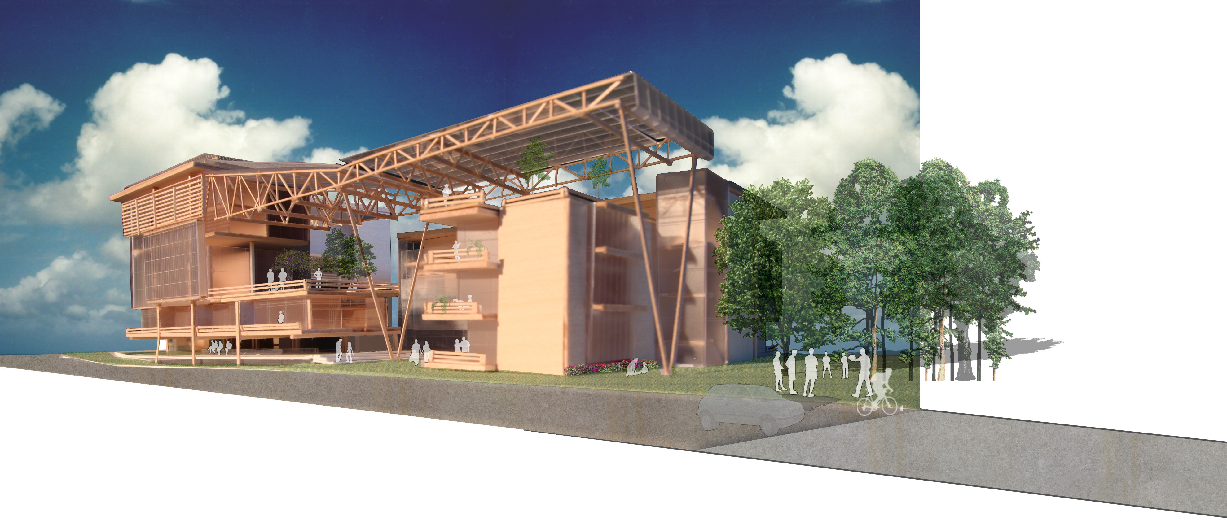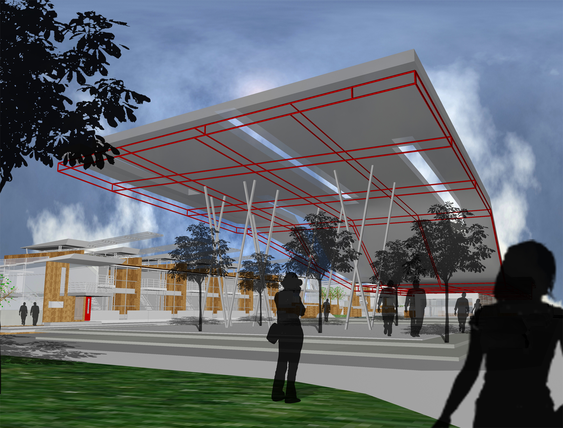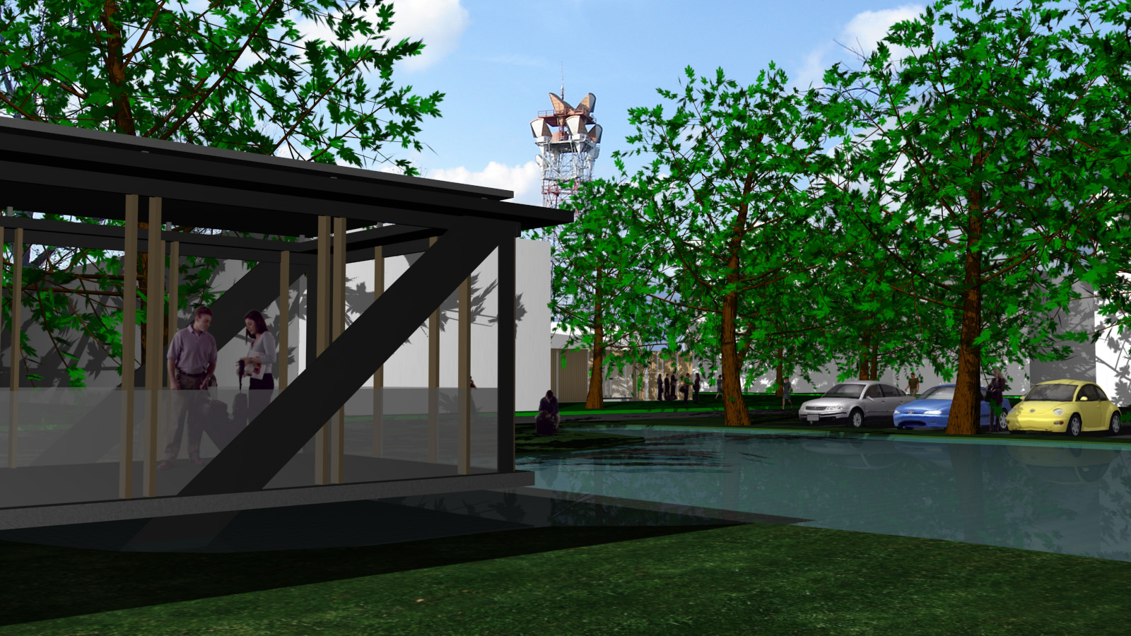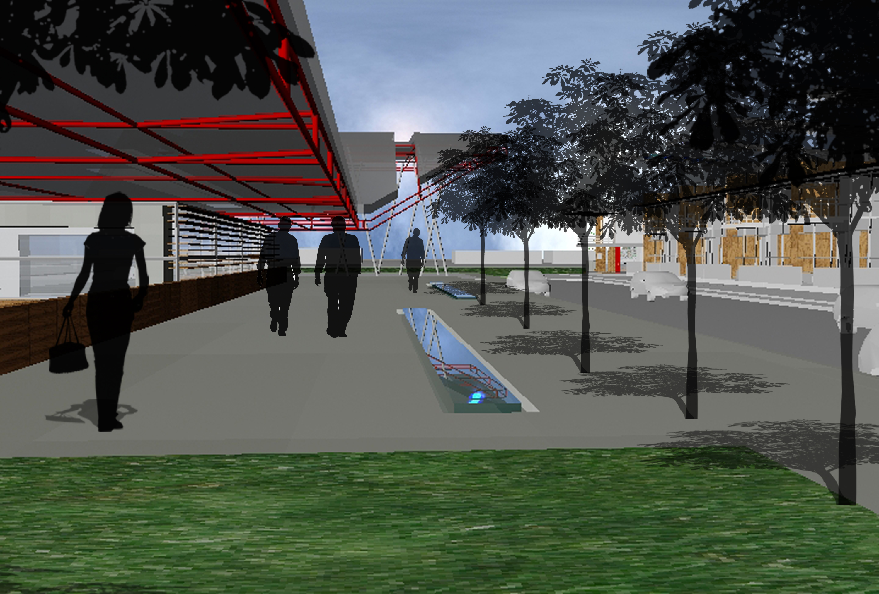 Drawing literally from the line of the railroad yet expanding the idea of a core infrastructure that supports a unique urban condition, PV Park incorporates a photovoltaic (sun electricity) power generator for an urban park in the town. This power generating system makes urban gestures to create civic space, enhance pedestrian circulation, provide needed shade and of course, generate electricity. As an infrastructure, the system is completely expandable and able to accommodate both private and public investments.