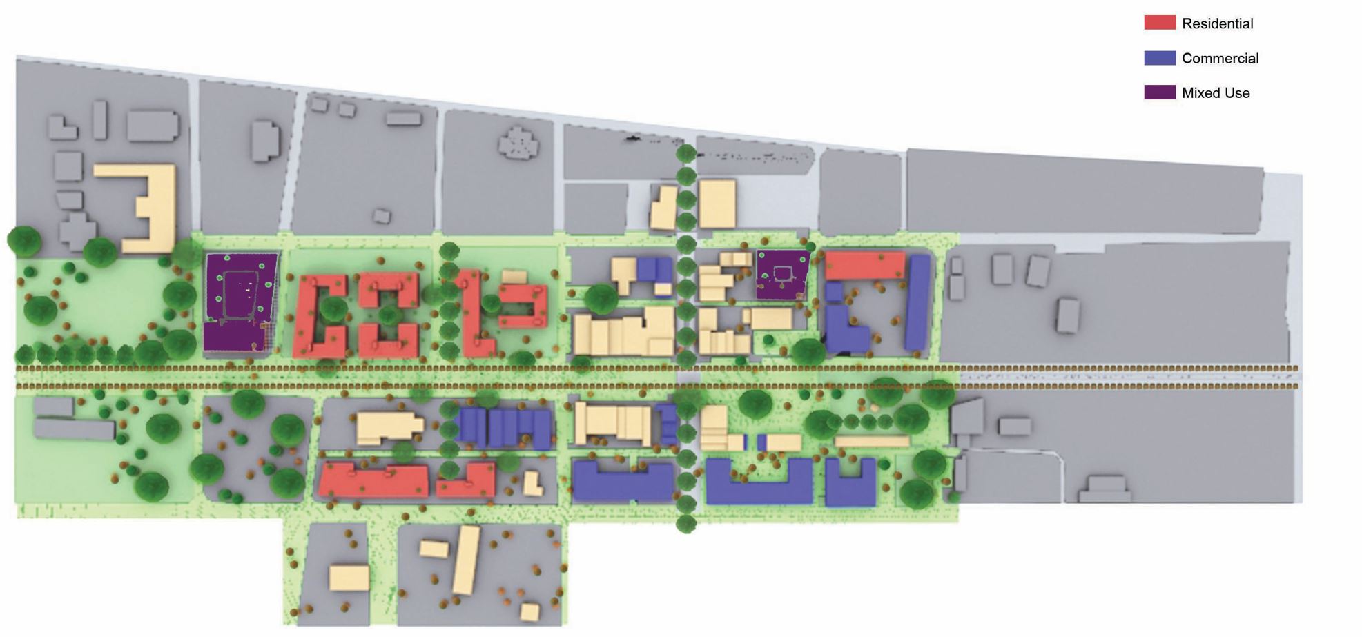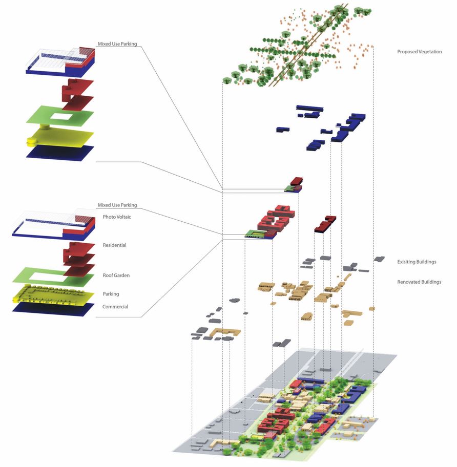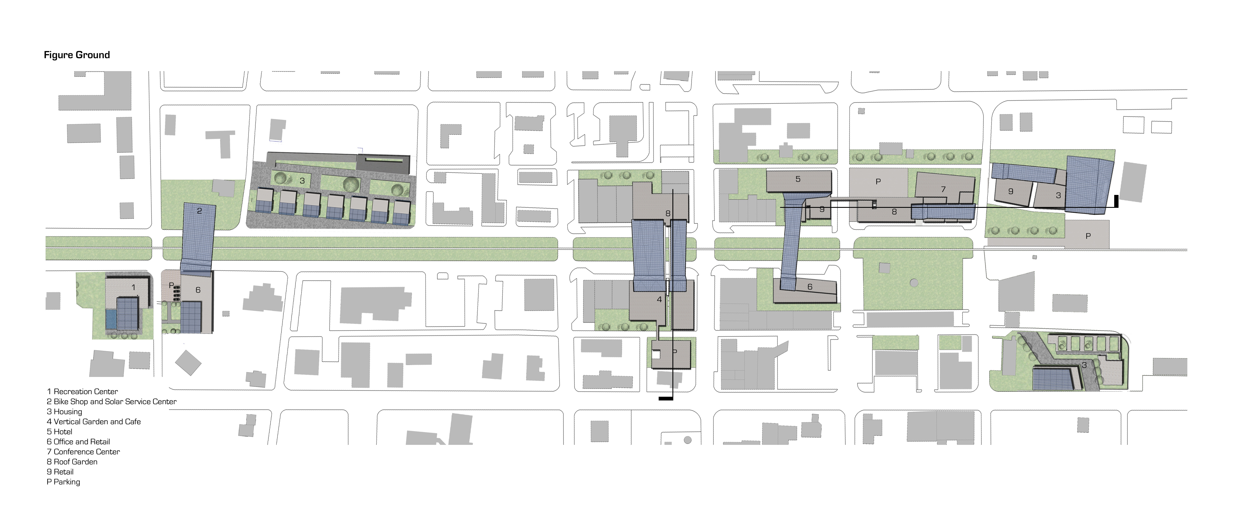 1) Row Housing 2) Parking Garage 3) Pavilion 4) Commercial Center 5) Civic Park
