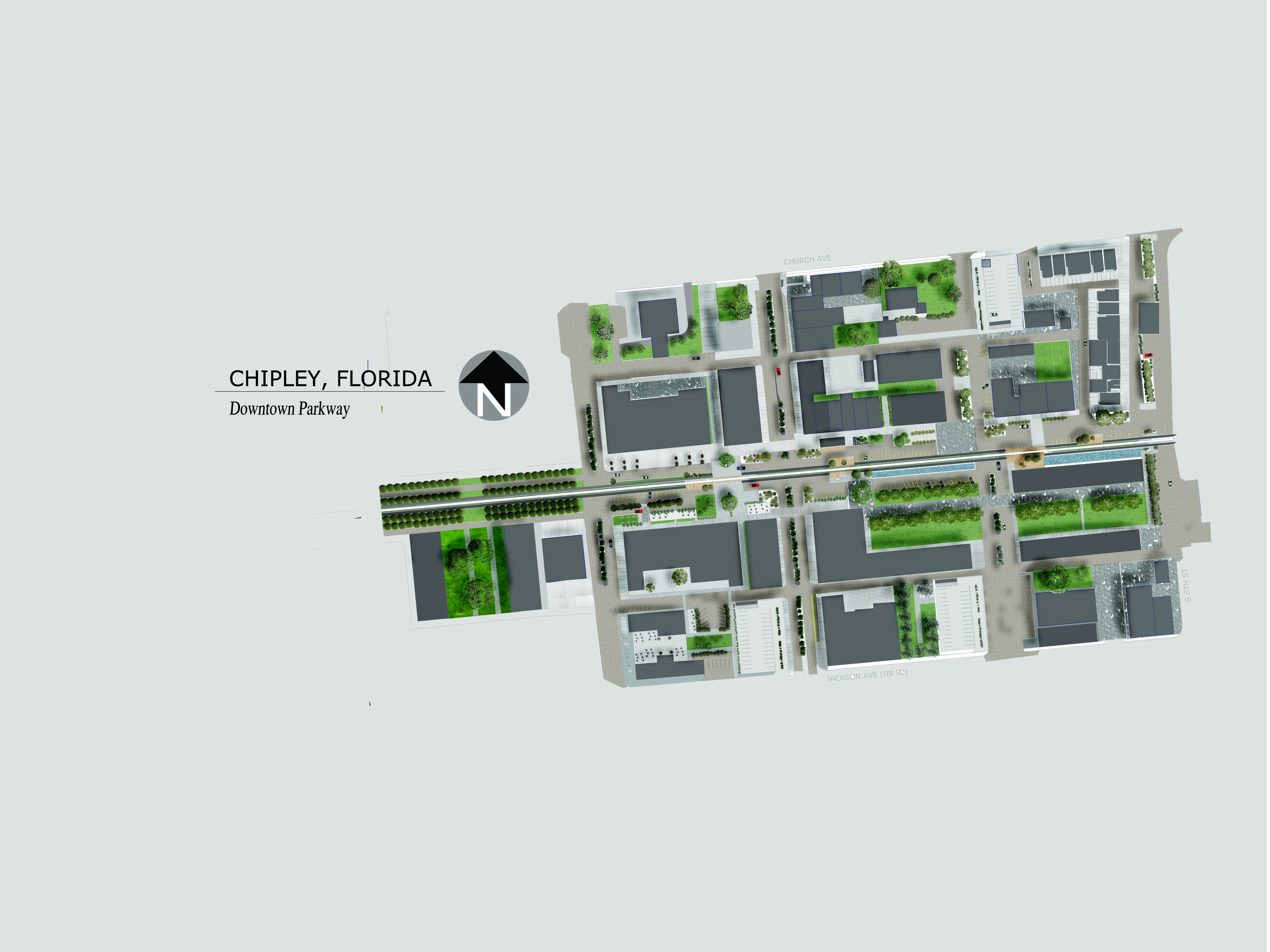 Analyzing the city in its present condition, the severe gash/byproduct of the railroad disconnects the urban activities on the south side of downtown from the north. In addition, the commercial activities downtown has suffered immensely due to a lack of housing in the core. On a human scale, Chipley is experiencing a pre-Urban condition where people lack dialogue with the fabric of the city, aiding in the deterioration of downtown. The sidewalks are segmented and unappealing, and they lack the quintessential necessities that pedestrian-friendly pathways require. As a result, citizens are highly discouraged from walking a mere block. The nonexistent flow of people, in conjunction with the highly segmented pedestrian ways, creates a cyclical termination of newly established local businesses, ultimately impeding urban development.