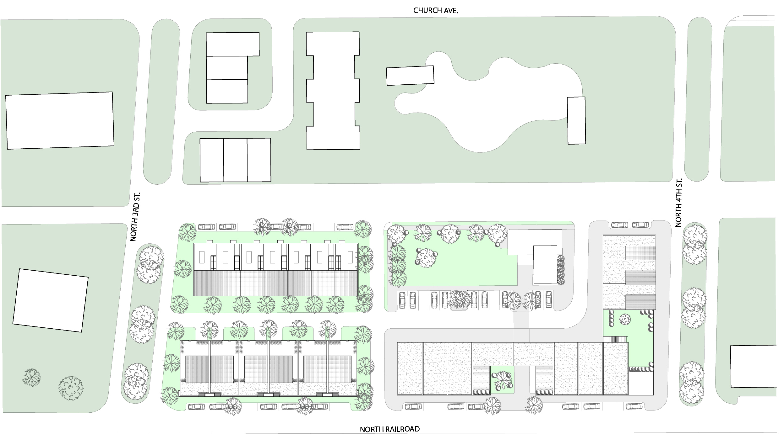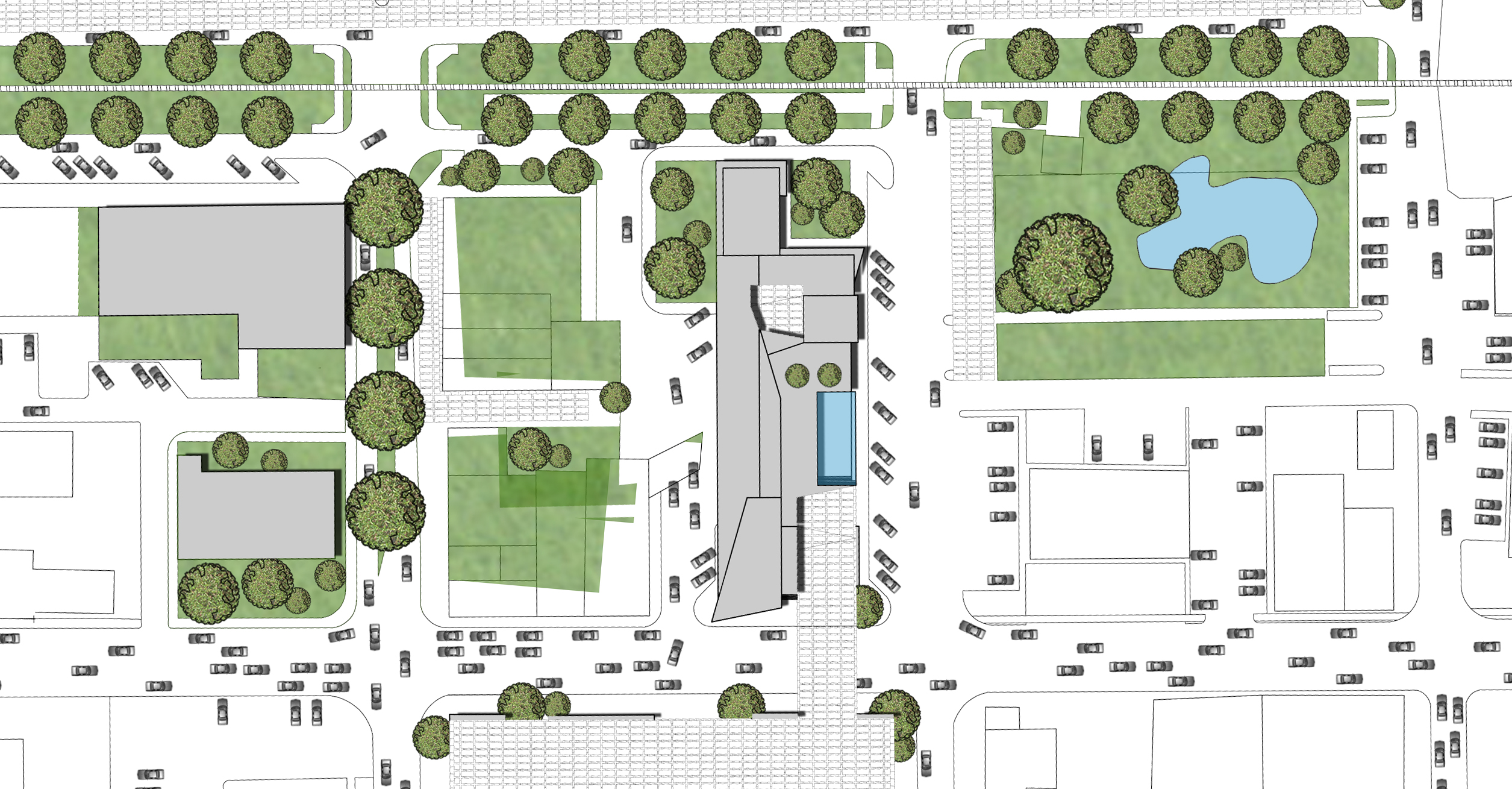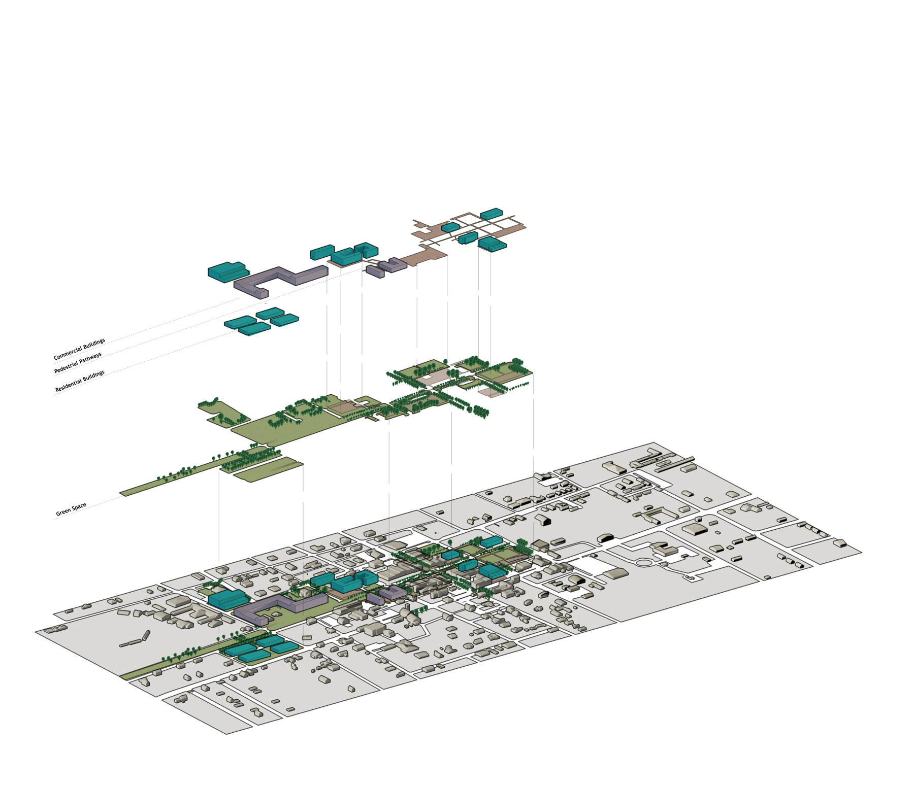 Private outdoor spaces are reduced but maintained in favor of community-oriented Urban Rooms operating at civic scales and semi-private as needed. This conceptual approach also advances market diversity so housing units or varied price points, amenities, and sizes are gathered around an ‘Urban Room’ to provide full-life opportunities for living in the town core. This approach will attempt to enhance existing underutilized spaces through occupation, view, and connectivity.