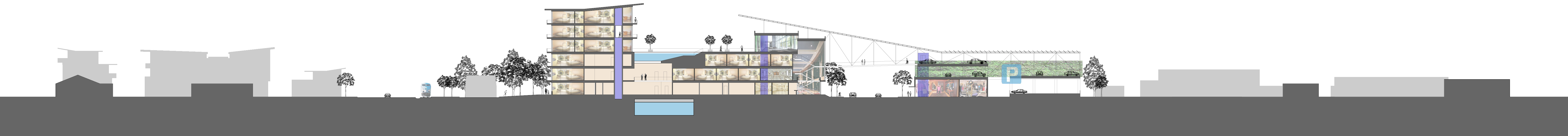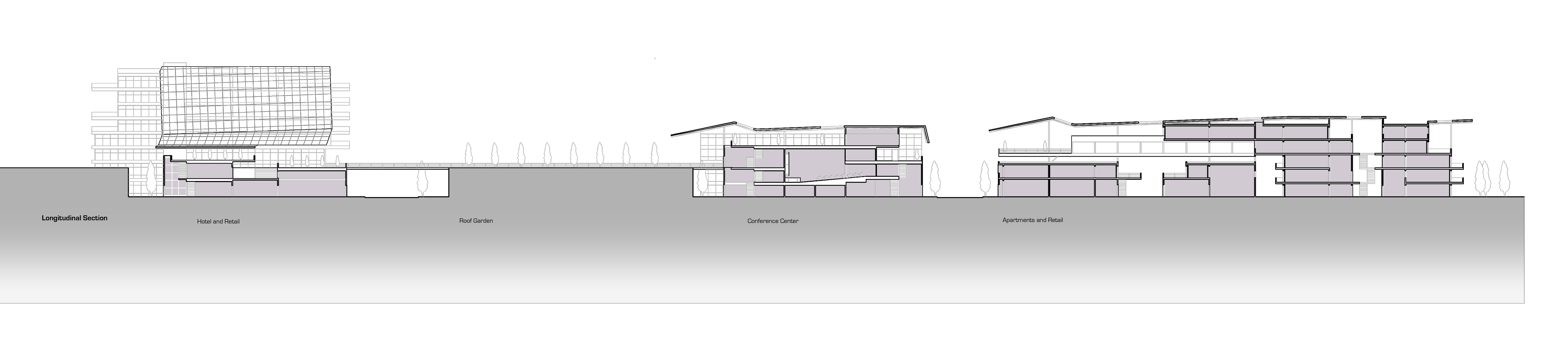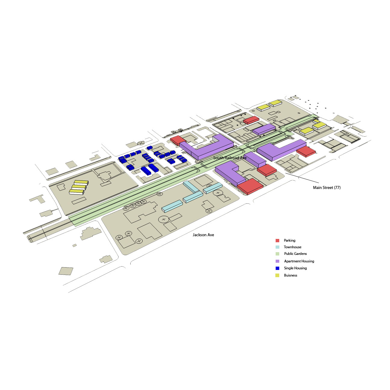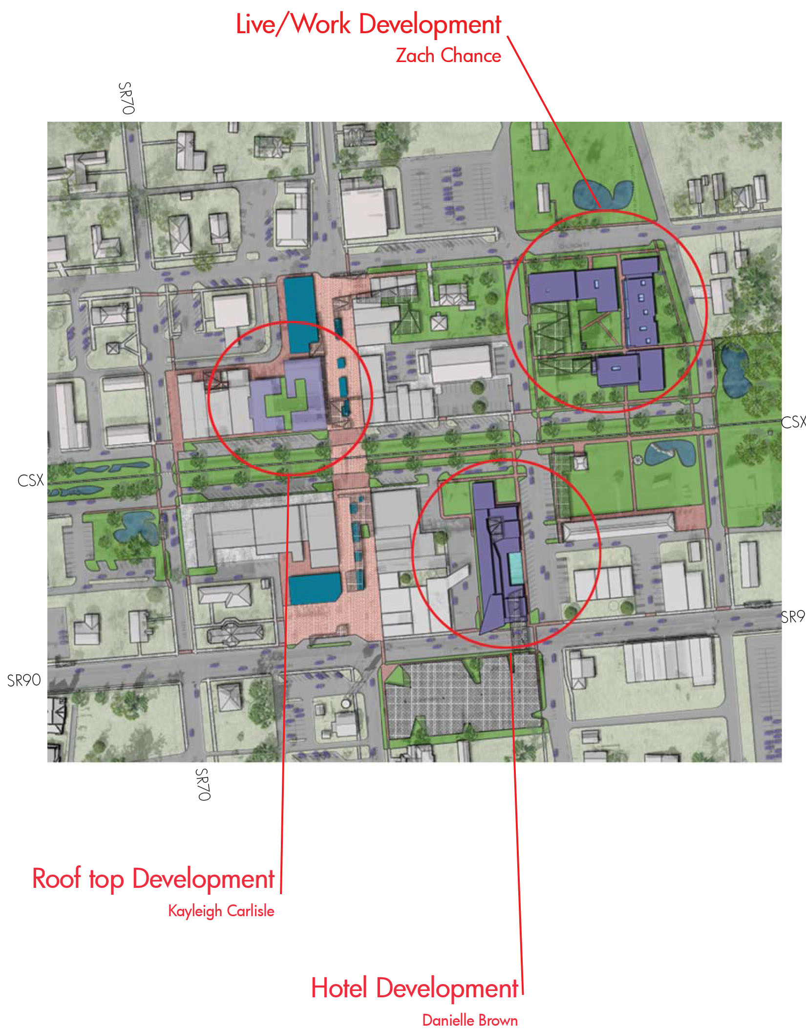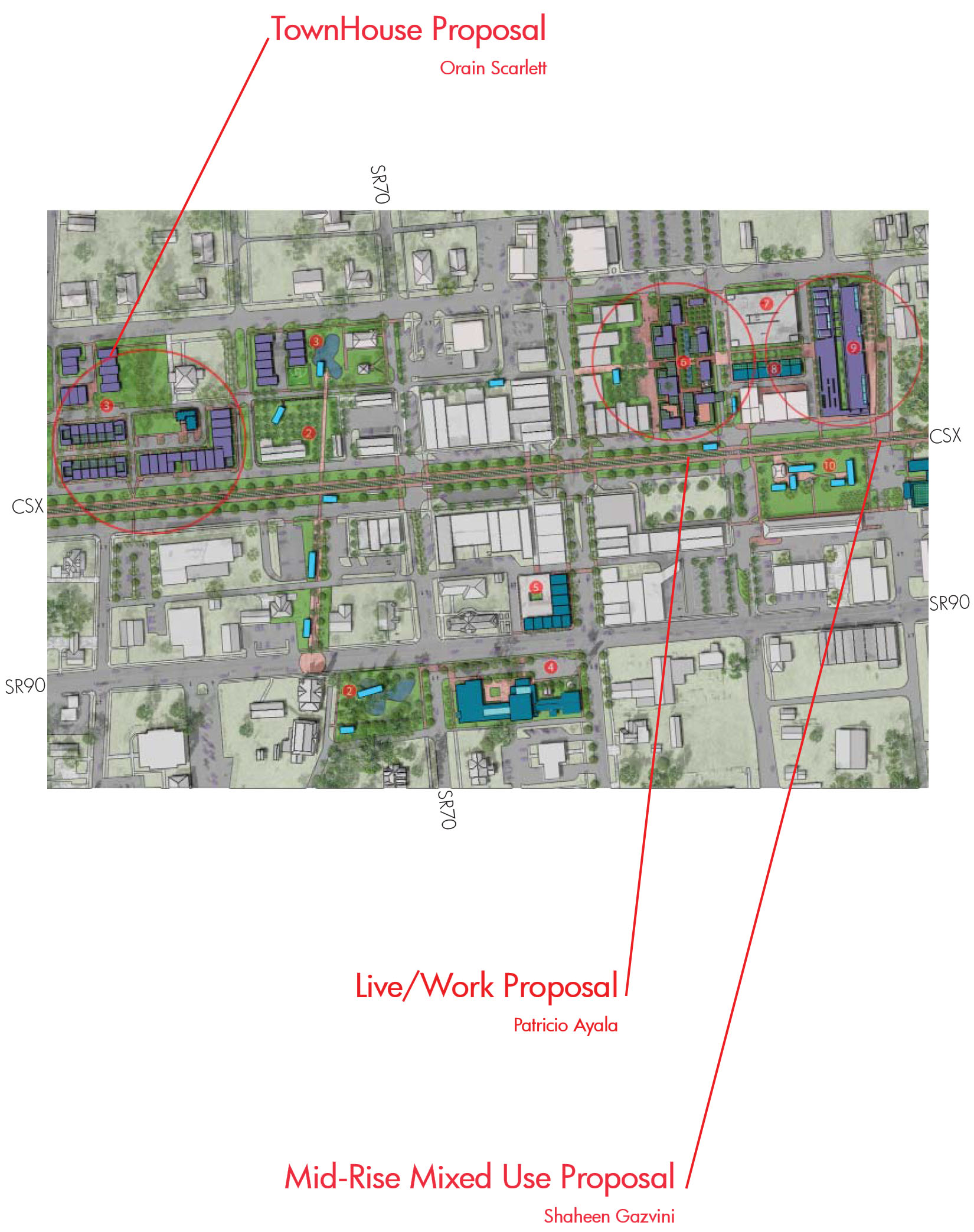 The projects developed within this scenario take advantage of connectivity to the railway as linear green space while reconciling adjacency to the pedestrian mall and auto-dominated streets. Varied programs including hotel, apartment, and mixed-use try to optimize the opportunities generated by relocating SR 70.