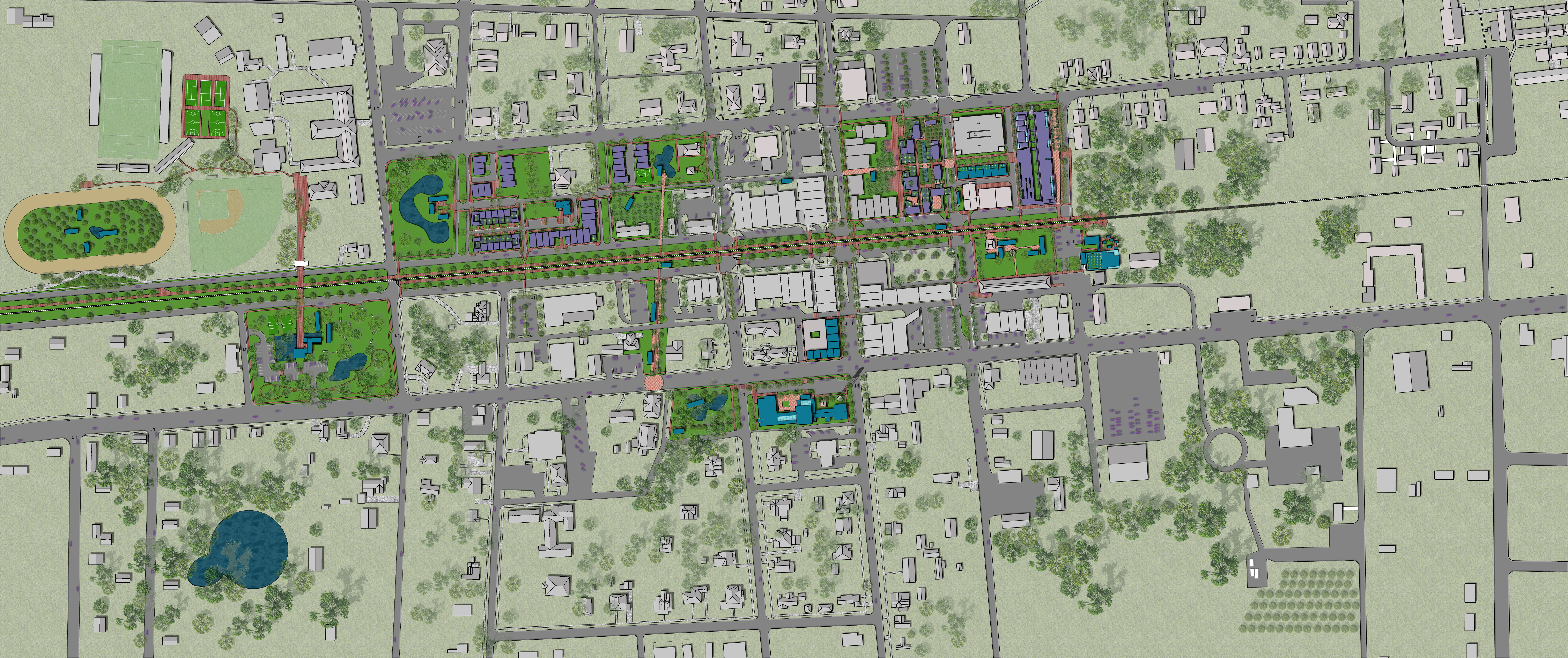 The notion of suturing Chipley together by weaving green space across the railroad and linking commercial activities via pedestrian-friendly pathways will in turn create a coherent interaction between its people and architecture. Integrated with the various scales of urban green spaces (occupiable, passive, and stormwater spaces) are the pedestrian ways, and as a result, a friendlier atmosphere will be installed. Simultaneously, these pathways work on a larger scale to stitch together different zones in and around downtown, helping to mitigate the segregating effect of the railroad.