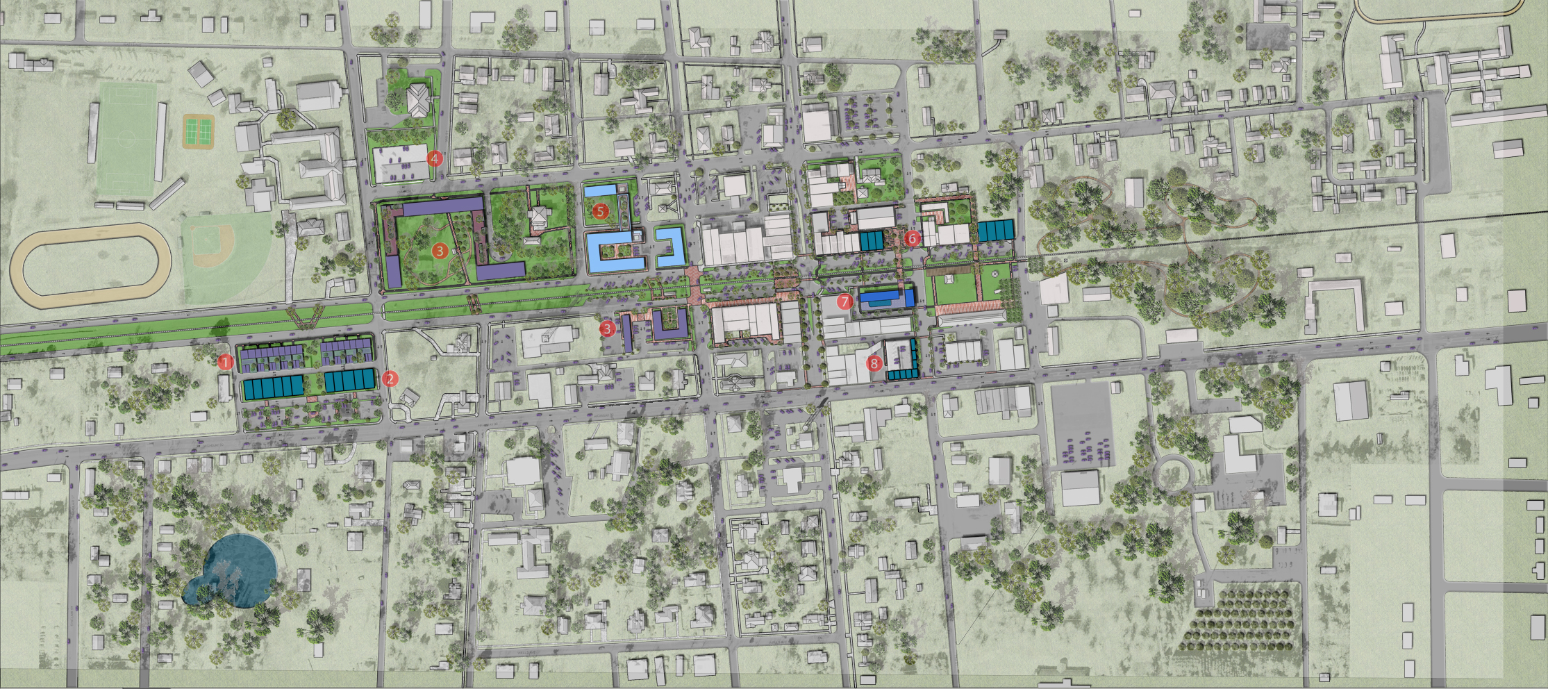 This scheme emphasizes the lineage and heritage of the railway as a core element in downtown Chipley while deploying strategies to make connections (sutures) across the spatial gap that the track creates the downtown. Sutures are strategies that stitch or connect the urban tissue to achieve a more connected pedestrian tissue.