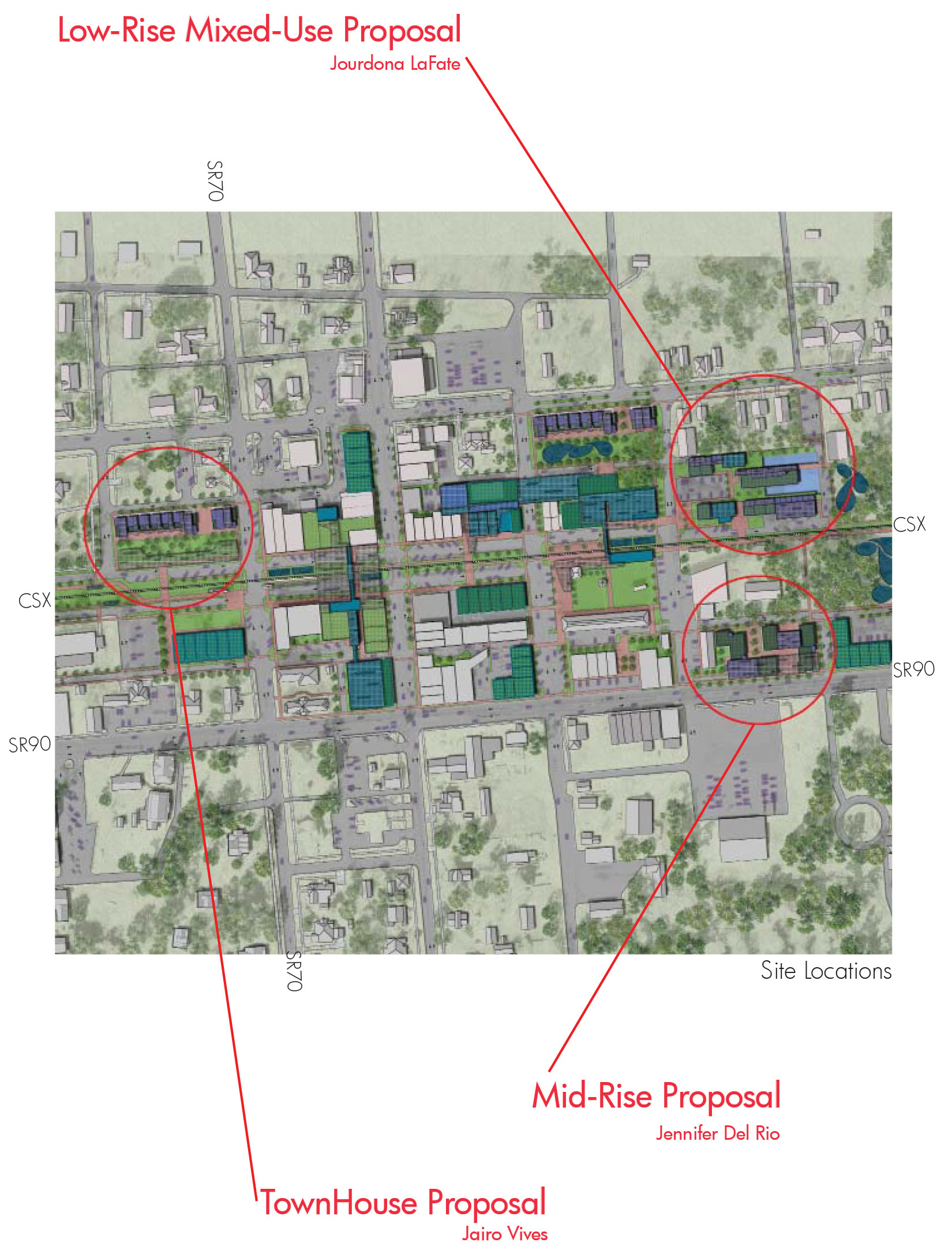 New housing is proposed for the eastern and western edges of the downtown core, with a low-rise row housing project on the western edge and a 6-story mid-rise apartment building on the east. The proposed apartment complex will have a density of 80 units per acre, far more than the surrounding single-family homes, and will allow for a flow of people to exist downtown. In addition, the buildings are also mixed-use facilities that will aid the economic deficit occurring in this area of Chipley.